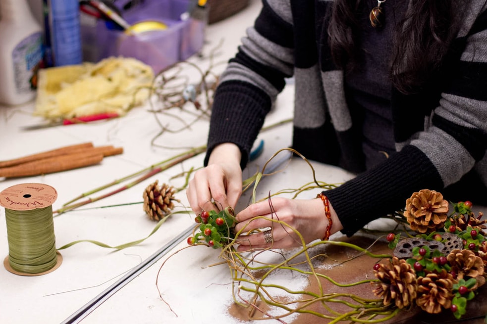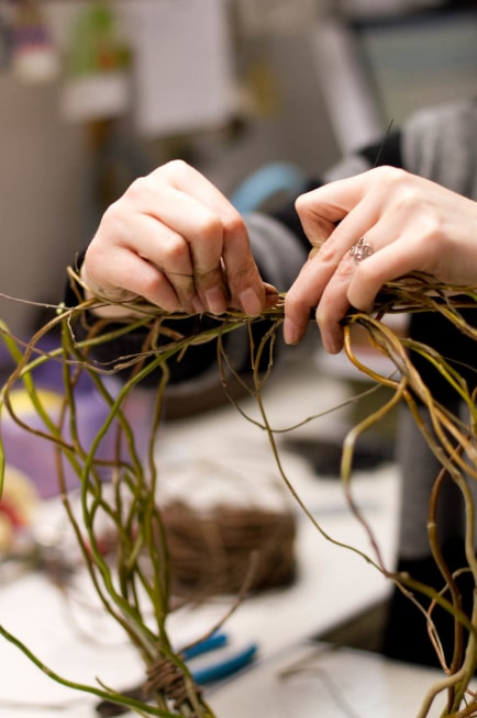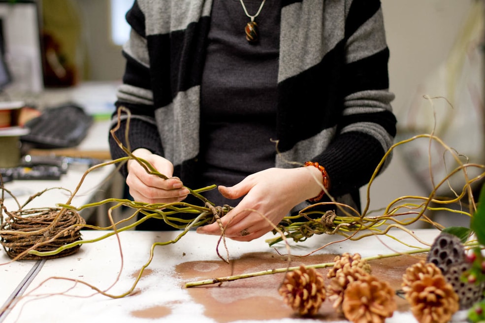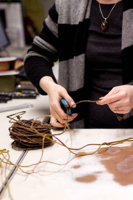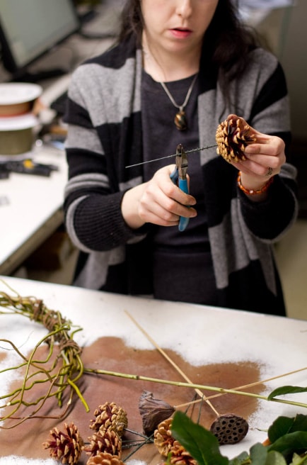 Nous préparons les cônes et les fixons à la pièce à l'aide de fil métallique.