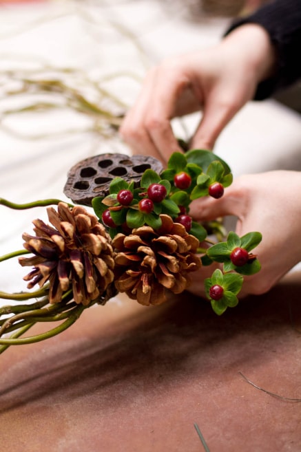 Nous ajoutons des branches d’hypericum et des boîtes de graines de lotus à la composition.