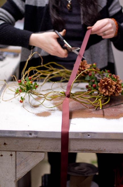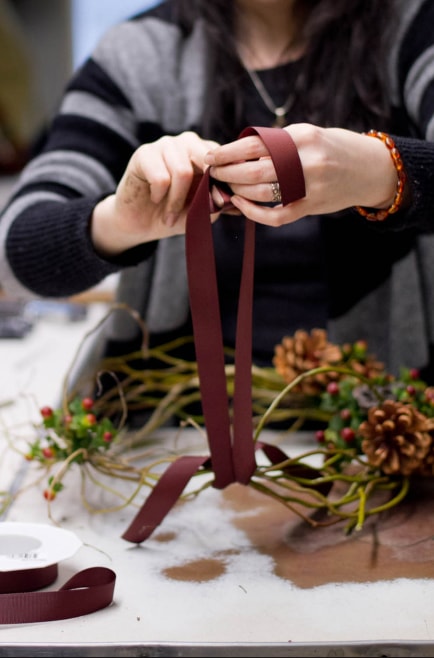 Nous enveloppons la guirlande avec du ruban et faisons un nœud. Coupez les extrémités pour qu'elles pendent légèrement.