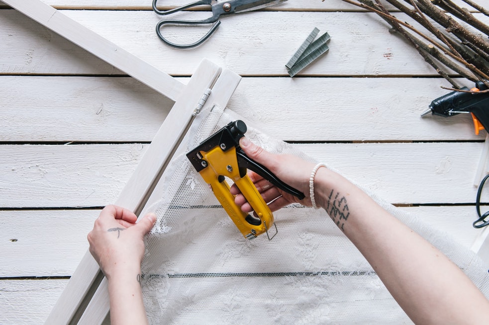 À l’aide d’une agrafeuse, nous fixons un morceau de tissu sur l’écran. Il est très important de le tirer pour qu'il ne s'affaisse pas.
