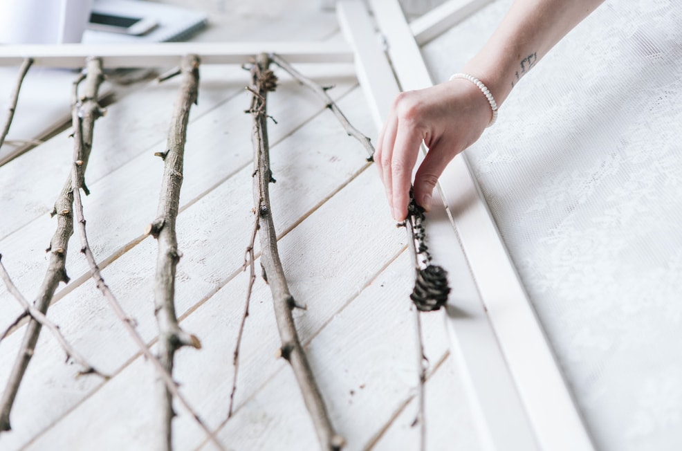 Nous attachons les branches au cadre en bois avec un pistolet à colle.