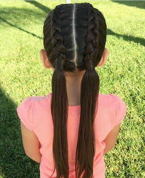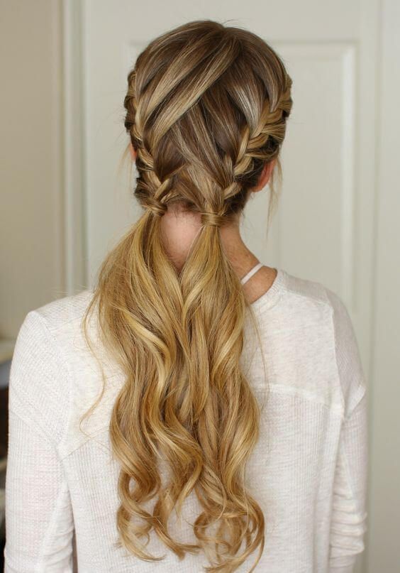 Non moins populaires sont les coiffures basées sur des tresses. Il peut s'agir d'épillets simples et familiers ou d'une option légèrement plus complexe, comme sur la photo. Pour faire cette coiffure, divisez les cheveux en deux parties avec une séparation. Tresser la tresse française de chaque côté et les relier avec un élastique. Une coiffure simple mais en même temps très belle est prête!