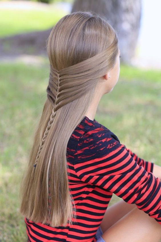 Une excellente option pour une fille aux cheveux longs serait une coiffure appelée queue de poisson. Mais il ne s'agit pas de la version classique, mais de la version asymétrique.Pour ce faire, faites une séparation en zigzag et tressez simplement vos cheveux en utilisant une technique classique. Lorsque la tresse est prête, peluchez les mèches, en les tirant alternativement du haut vers le bas.