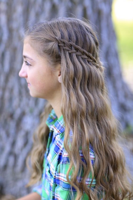 Les adolescentes apprécieront des coiffures plus complexes, mais en même temps inhabituelles. Par exemple, une cascade est particulièrement belle sur les cheveux longs ou moyens. Avec cette coiffure, les cheveux peuvent être enlevés des yeux, ils n'interféreront donc certainement pas dans la salle de classe. Pour commencer, peignez les cheveux sur le côté et sur le dessus ne séparent que deux mèches, comme sur la photo. Reliez-les avec du caoutchouc de silicone. Tournez la queue et faites une autre petite queue à partir des deux autres brins. Répétez le même processus et tirez les brins légèrement pour plus de volume.
