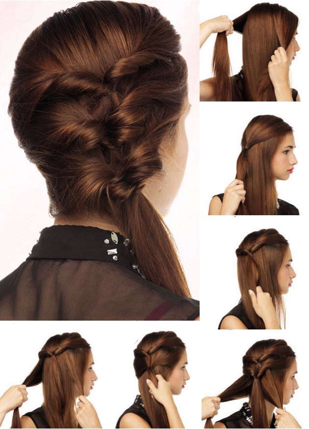Il existe de nombreuses coiffures dans lesquelles une simple queue est utilisée. Dans ce cas, vous devez l'attacher sur le côté. Ensuite, séparez une petite mèche de cheveux et tressez une simple queue de cochon. Enveloppez-le comme indiqué sur la photo et corrigez-le également. Si vous le souhaitez, les cheveux peuvent être légèrement tordus. Chaque fille va certainement apprécier une telle queue.