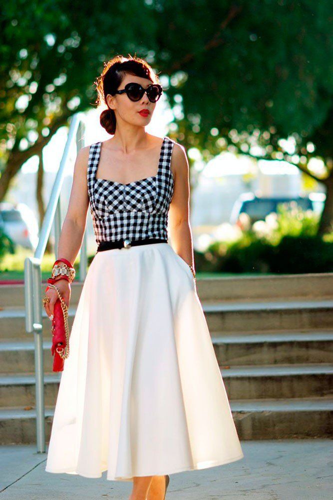 Par exemple, une jupe plissée avec un simple t-shirt ou un t-shirt à fines bretelles est une excellente solution pour la vie quotidienne et pour un rendez-vous galant. Si vous le souhaitez, vous pouvez expérimenter avec la couleur en créant une emphase dans l'image. Surtout, n'oubliez pas les accessoires, car ils contribuent à rendre l'archet complet et harmonieux.