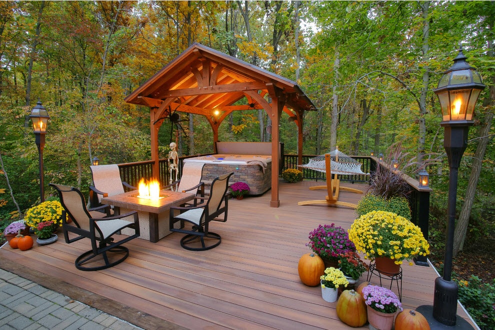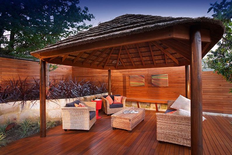 Ce bâtiment, originaire des pays tropicaux, bien que de petite taille, peut toutefois accueillir tous les éléments nécessaires à la détente. Le gazebo de style bungalow a rassemblé certaines des caractéristiques stylistiques d'un tel bâtiment.