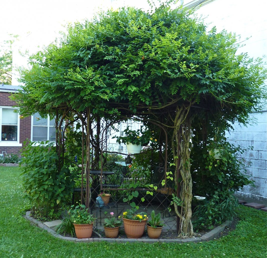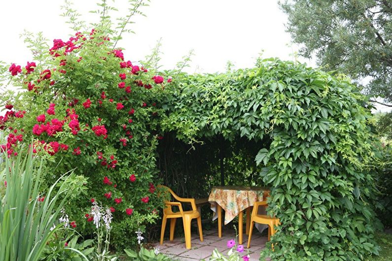 Pour ce type de tonnelle, vous devez choisir des arbres et des arbustes qui ne poussent pas beaucoup en hauteur. Dans les premiers stades de la croissance des plantes et de la formation de leurs couronnes, des cadres métalliques sont utilisés. De cette façon, vous pouvez décorer des tonnelles en bois et en pierre.