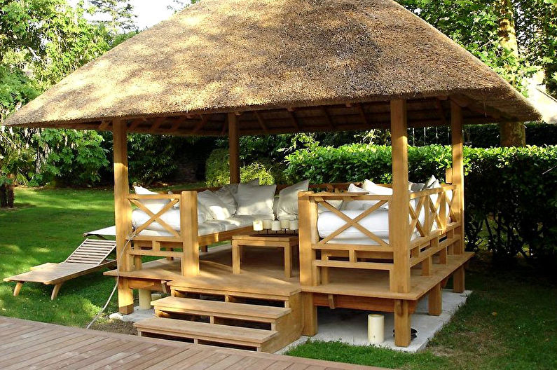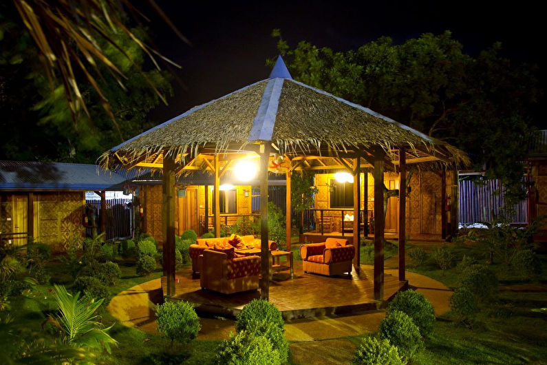 Ce bâtiment, originaire des pays tropicaux, bien que de petite taille, peut toutefois accueillir tous les éléments nécessaires à la détente. Le gazebo de style bungalow a rassemblé certaines des caractéristiques stylistiques d'un tel bâtiment.