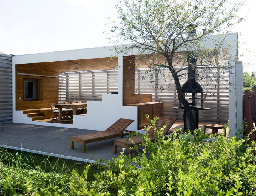Vous pouvez faire une sorte de verrière. Mais si vous faites déjà des efforts, il est préférable de créer un kiosque de jardin dans lequel vous pourrez facilement préparer vos repas. La construction doit être de type semi-fermé ou ouvert. Lorsque vous organisez un barbecue, un gril ou un barbecue, vous devez tout d’abord veiller à la sécurité incendie, ainsi qu’à un lieu de stockage du bois de chauffage, du charbon, de la vaisselle et mettre une table de coupe.