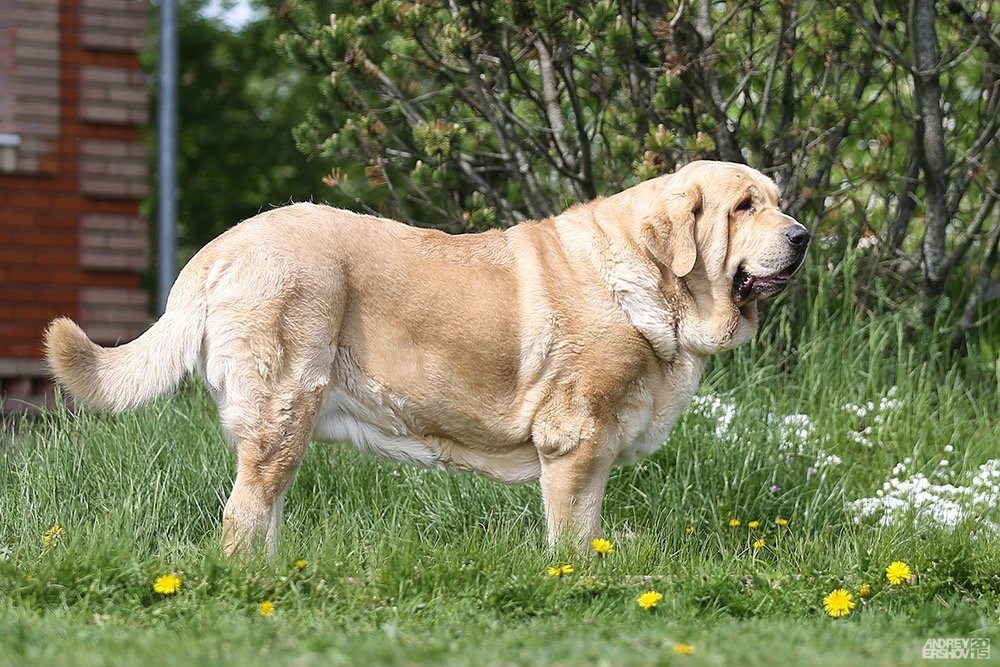 Ferme les trois leaders dans le classement de la plus grande race de chiens - le dogue espagnol. Ce sont des gardes loyaux et loyaux. Ils ont dans le sang pour préserver les animaux faibles et protéger le bétail. Le poids du chien est de 70 kg, la taille est de 80 cm, mais même avec ces paramètres, pour les petits enfants, le chien est une excellente nounou. Une psyché stable permet au chien de réagir de manière adéquate à toute situation et de socialiser rapidement.