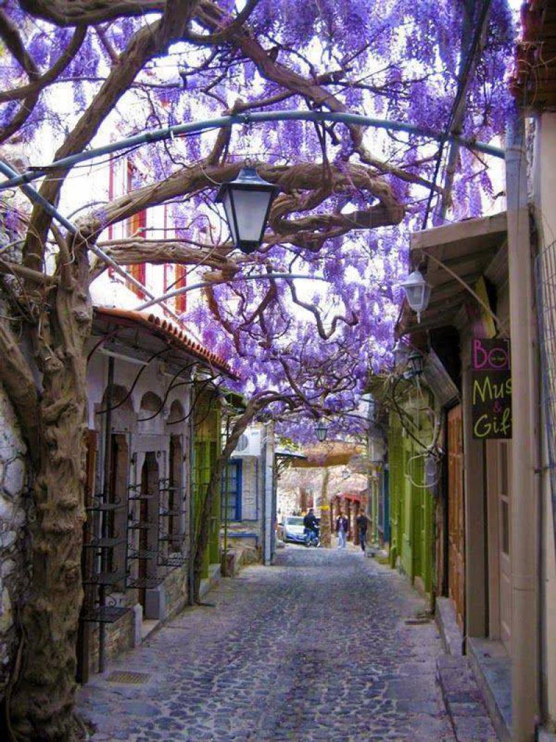 Molyvos est un joli petit village en Grèce et le plus bel endroit du pays. Sa rue ne peut pas être notée. La rue principale du village est pavée de pierre et entourée de glycines. La rue est comme enveloppée dans les branches de cette plante inhabituelle et toujours à l'ombre. Et lorsque la glycine fleurit, tout est peint dans une délicate couleur pourpre.