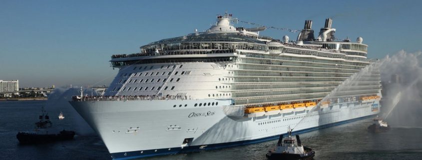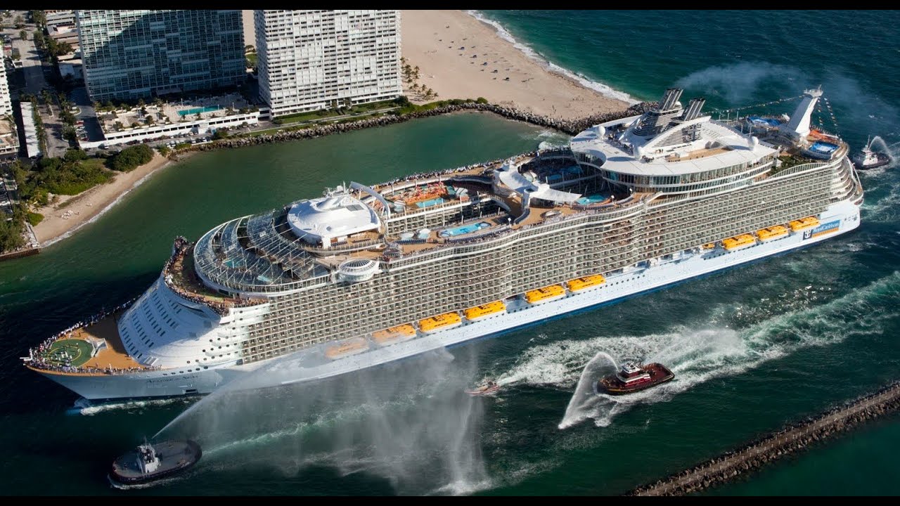 Le navire de croisière de classe Oasis a été lancé en 2008. Cet incroyable géant peut accueillir 6 296 passagers à bord, sans compter les 2 384 membres d'équipage! À bord se trouve une liste de divertissements énorme et variée. C'est une ville entière flottante. Il y a une patinoire, un parcours de golf, de nombreux bars, boutiques et même un parc avec de nombreuses plantes exotiques.