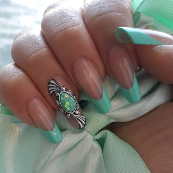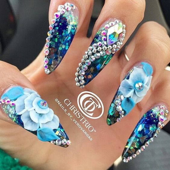 Il est difficile de perdre de vue le design inhabituel utilisant des flocons de yucca. Une telle manucure est considérée comme une très bonne option pour le printemps, car elle est entraînante, enjouée et audacieuse. Il attire les yeux des passants, il peut être admiré pendant au moins une éternité. Convient à l'agitation quotidienne.