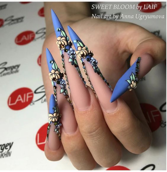 Il est difficile de perdre de vue le design inhabituel utilisant des flocons de yucca. Une telle manucure est considérée comme une très bonne option pour le printemps, car elle est entraînante, enjouée et audacieuse. Il attire les yeux des passants, il peut être admiré pendant au moins une éternité. Convient à l'agitation quotidienne.