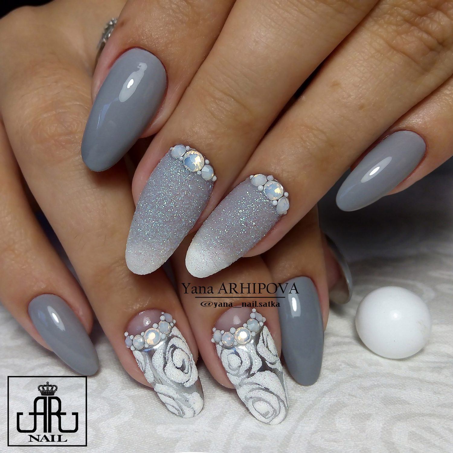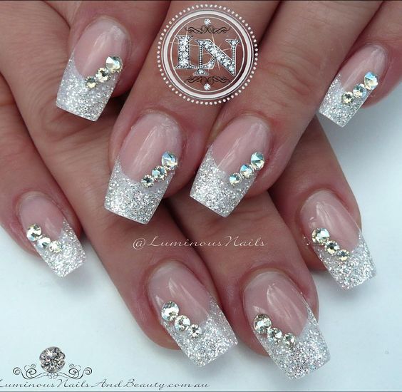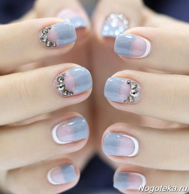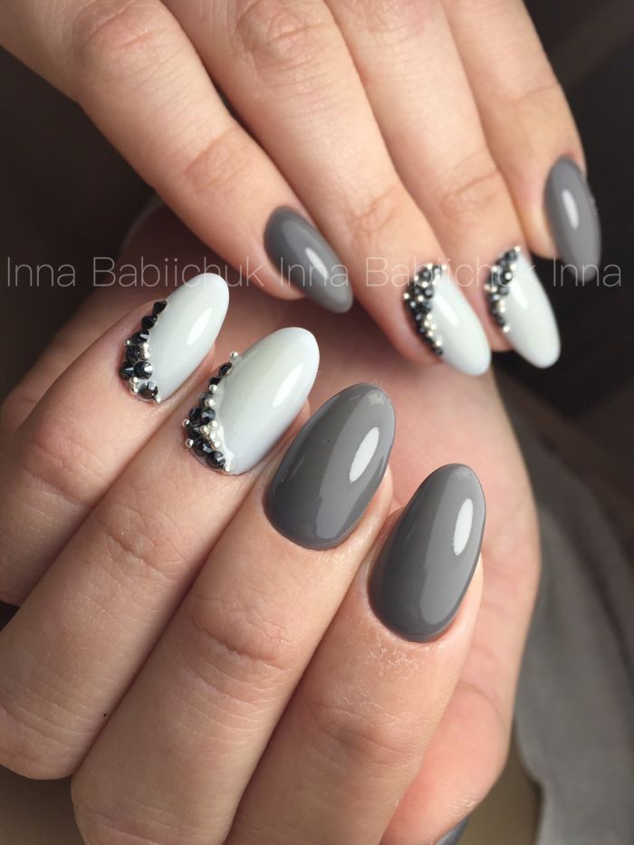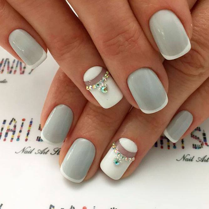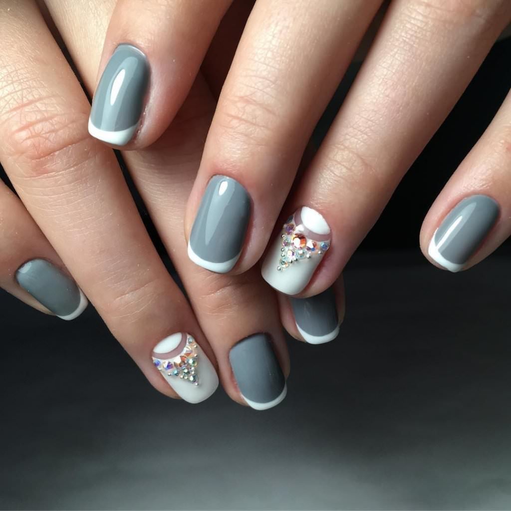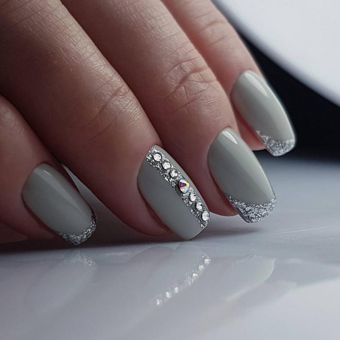 Tout le monde le sait depuis longtemps: pour donner à la manucure un aspect riche et incroyablement chic, vous pouvez utiliser des strass sur tout. Après tout, avec l'aide de pierres brillantes, les ongles féminins deviennent simplement expressifs et capables d'attirer l'attention des autres. Les strass peuvent être utilisés pour décorer la ligne du sourire, ainsi que des éléments supplémentaires pour créer l'ornement principal. Par exemple, si le souci sans nom aura un motif en forme de fleurs, les strass peuvent être utilisés comme décoration du cœur du bouton. Certains maîtres proposent de décorer la veste grise avec des strass, qui remplissent près de la moitié de la plaque à ongles. Cette option a un look très élégant et est en parfaite harmonie avec la robe de soirée.