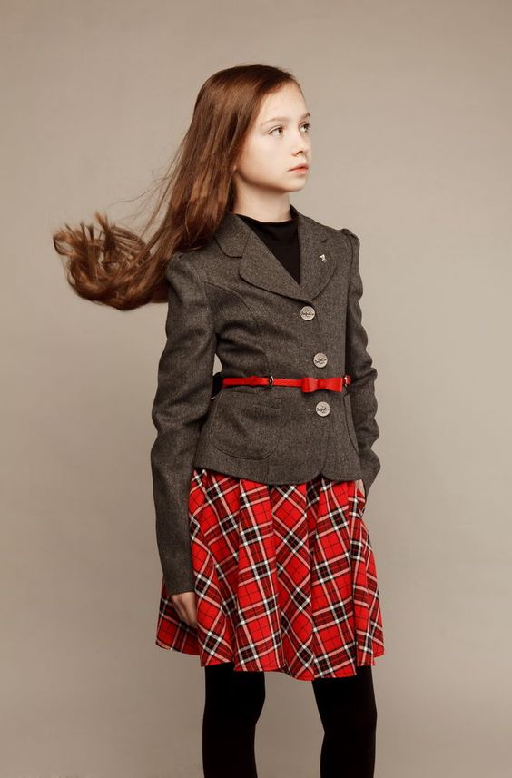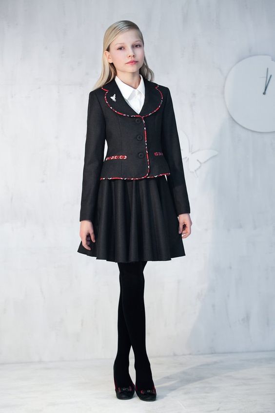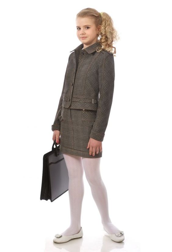 N'oubliez pas d'acheter un costume pour la fille. Et peu importe lequel vous choisissez: jupe ou pantalon.