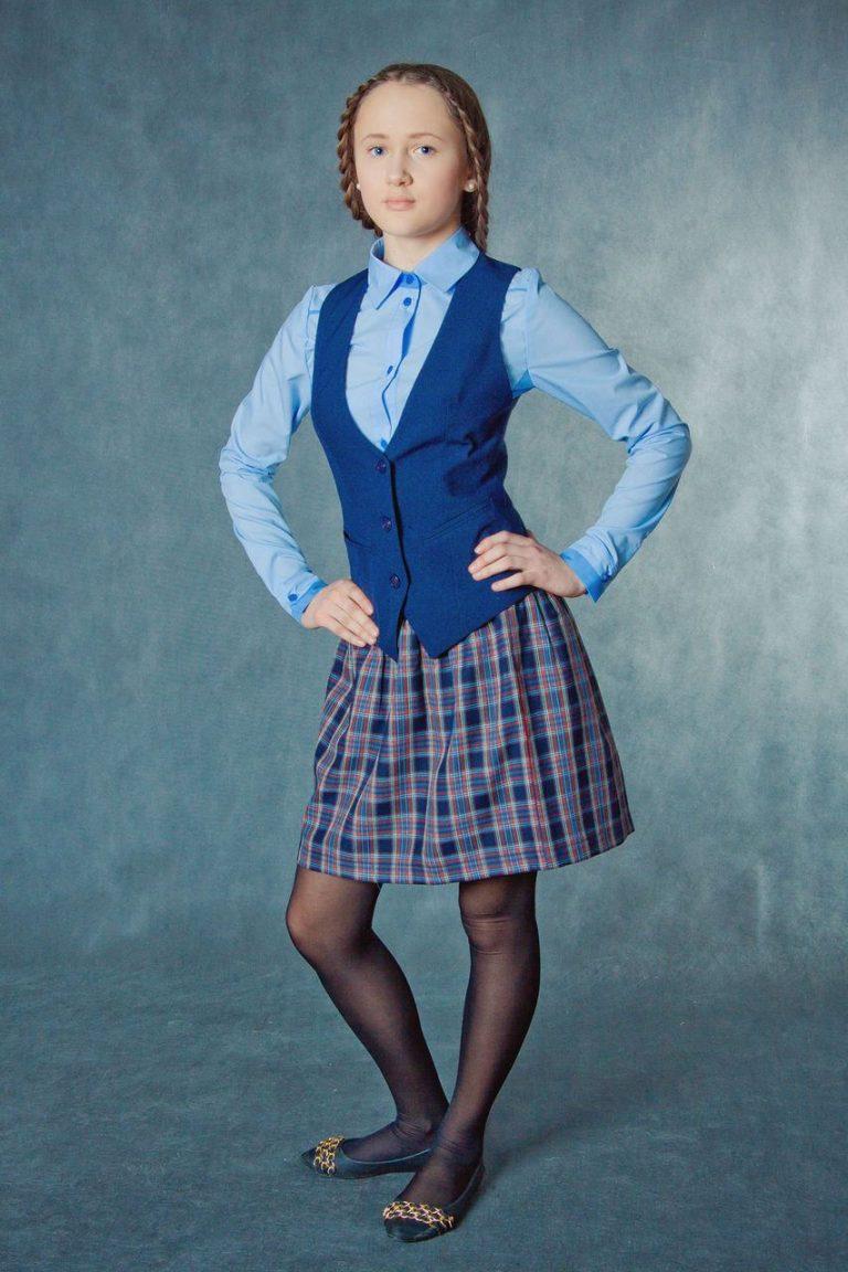 L'imprimé à carreaux bleu sur les vêtements d'école pour les filles, du moins pour les garçons, est plutôt joli. Une telle coloration est considérée comme classique, car les matériaux avec une cage bleue sont utilisés pour créer des jupes, des vestes, des robes, des pantalons, des gilets.