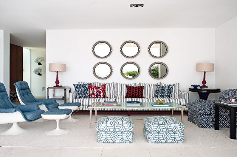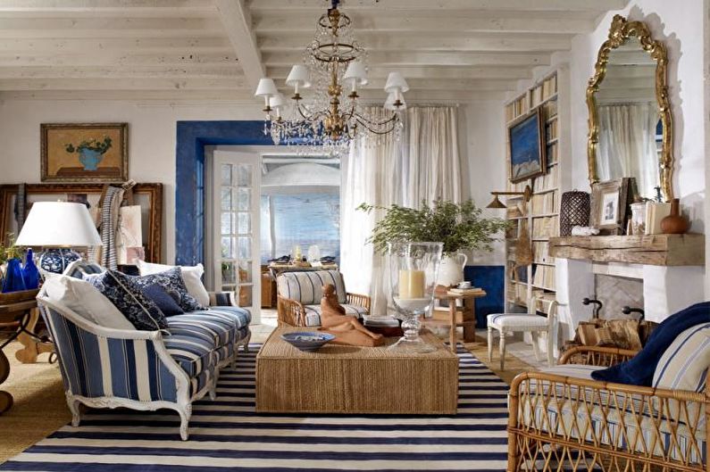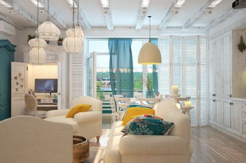 Une ambiance méditerranéenne aidera à incarner une approche individuelle et de l’imagination.Le décor utilise des peintures de paysages (côte, océan, mer), des accessoires faits à la main, des vases en verre, des cadres colorés avec des reflets bleus, des fleurs fraîches, un panneau de coquillages, des pierres de mer de formes variées. Il devrait y avoir beaucoup de lumière - lampes et lampes de sol, spots, appliques murales, lustres soignés.