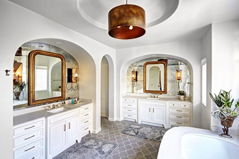 Avant le début et à la fin de la journée de travail, les gens se détendent dans la salle de bain. Le style méditerranéen est très propice à cela. Il devrait y avoir une cabine de douche ronde ou une baignoire, beaucoup de matériaux naturels qui peuvent être vus à la fois dans les accessoires de bain et dans les éléments de finition. Le plus souvent utilisé décoration dans le style égyptien ou romain.