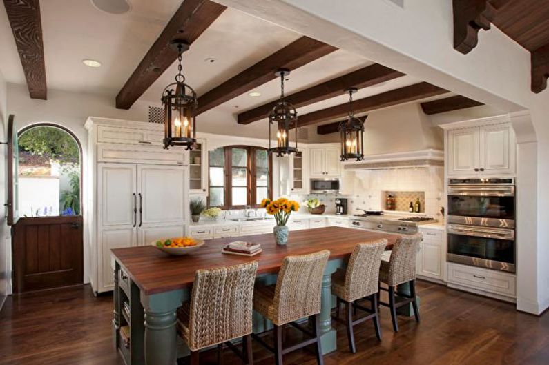 Lors de la décoration du plafond dans un style méditerranéen, les tons clairs et ensoleillés doivent prévaloir. Le blanchiment de haute qualité deviendra une solution esthétique et simple. Décorer avec des poutres en bois aura l'air très original.