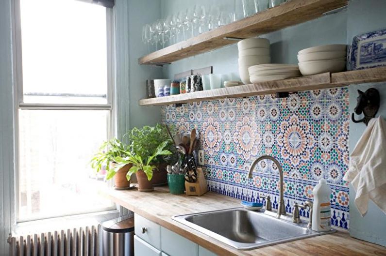 - La présence d'éléments de mosaïque. Pour les motifs méditerranéens, une telle option créative est considérée comme optimale. Ce décor est le plus souvent utilisé dans le couloir ou dans la cuisine. Carreaux de céramique peu profonds couramment utilisés.