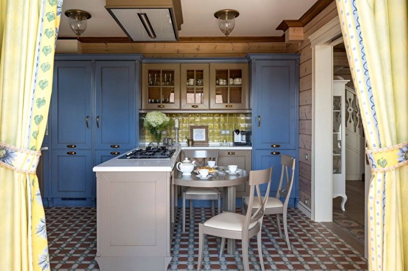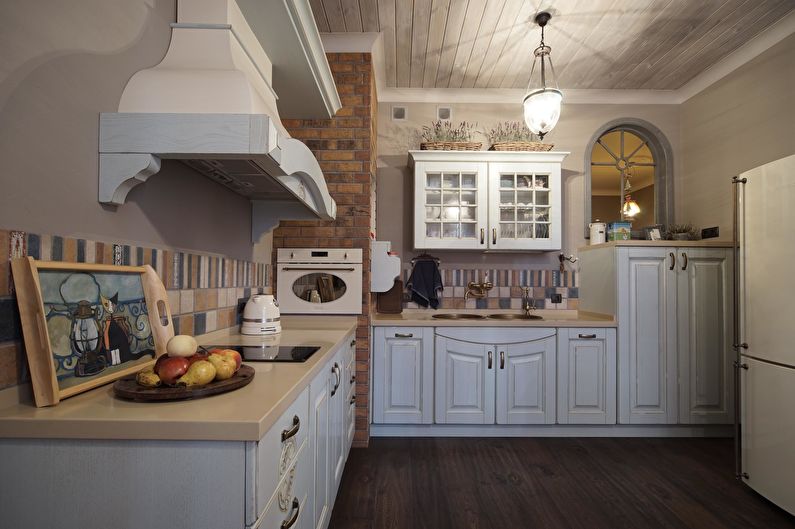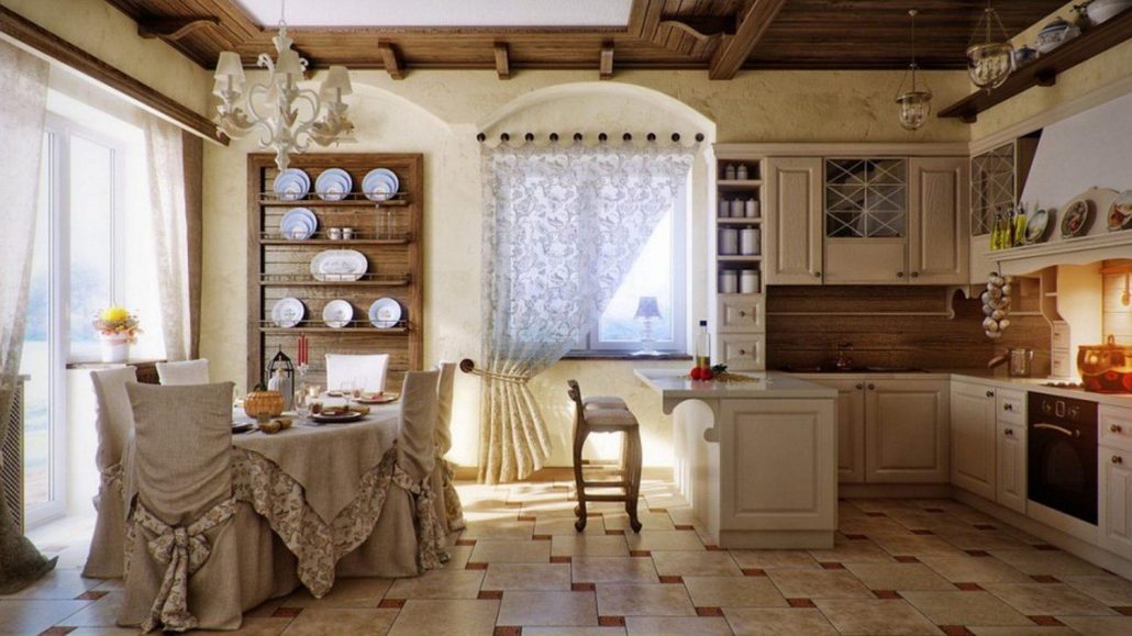 La cuisine de ce style doit être simple et avoir l’air le plus naturel possible. Vous pouvez accrocher des rideaux de coton décorés de rubans aux fenêtres. La table doit être recouverte d'une nappe brodée à la main. Les chaises doivent avoir des sièges moelleux. Et pour l’éclairage, il est idéal d’utiliser un lustre à base forgée. Pour la décoration, utilisez des peintures représentant une nature morte, des vases en argile et des plaques en céramique.