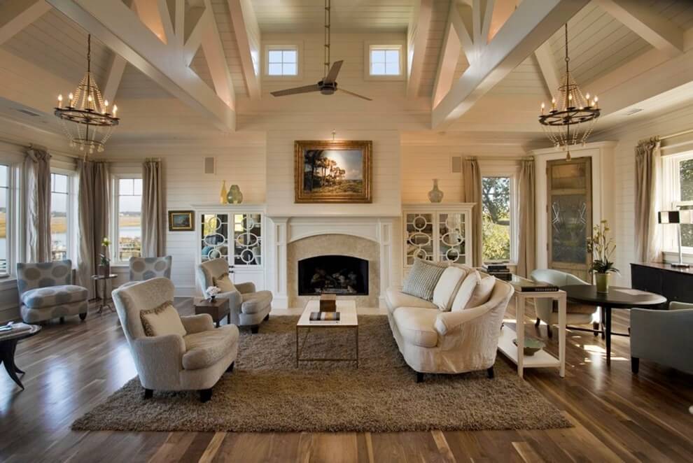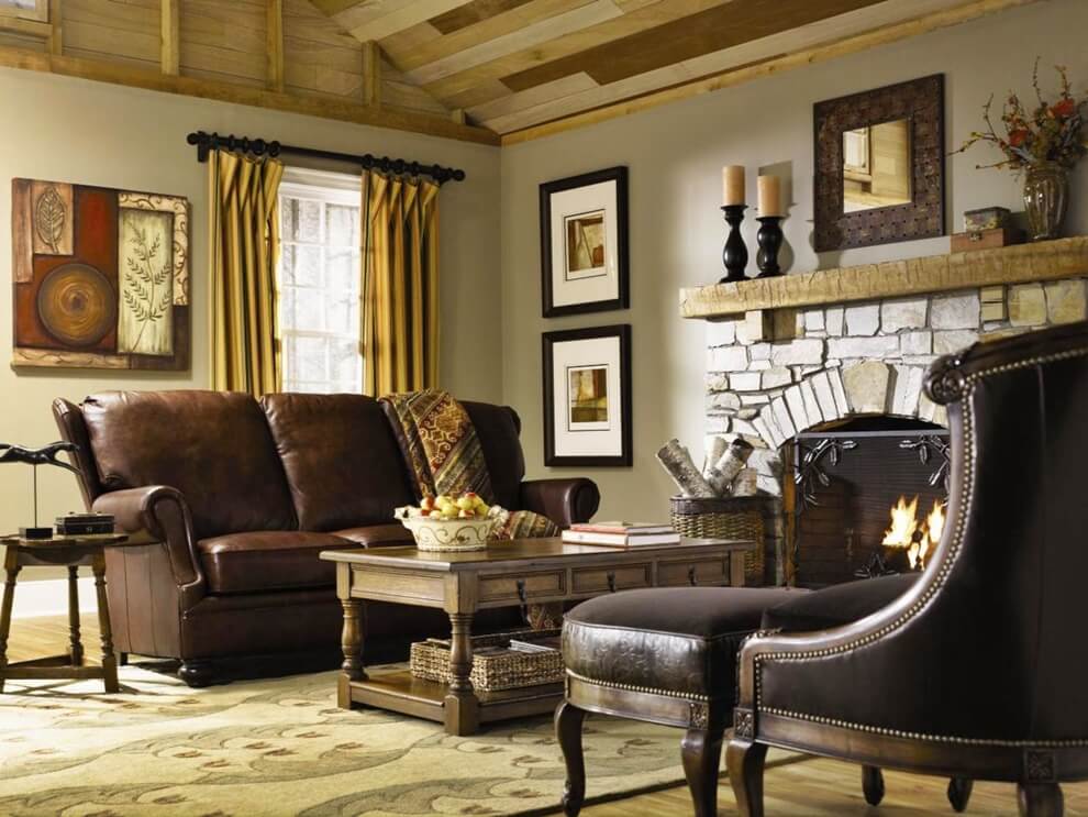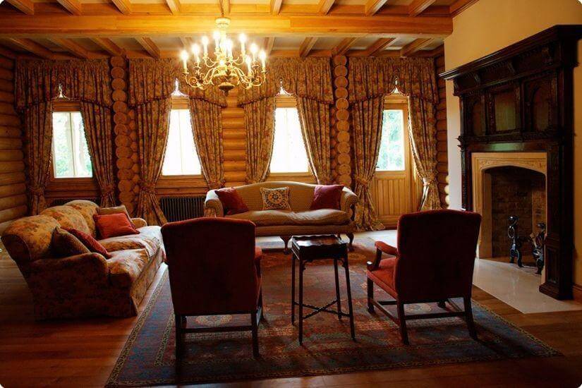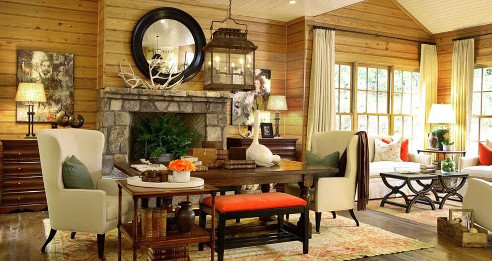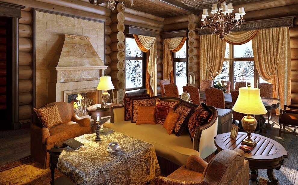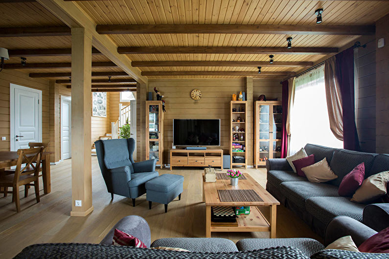 Cette pièce doit devenir la marque de fabrique de la maison, elle mérite donc un effort maximum lors de sa conception. Par conséquent, vous pouvez placer ici une cheminée, une table faite à la main ou une bibliothèque. Le sol peut être aménagé avec de la pierre décorative et des poutres en bois peuvent être fixées aux murs.