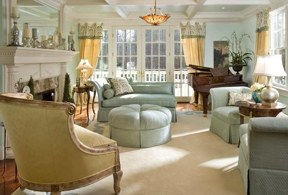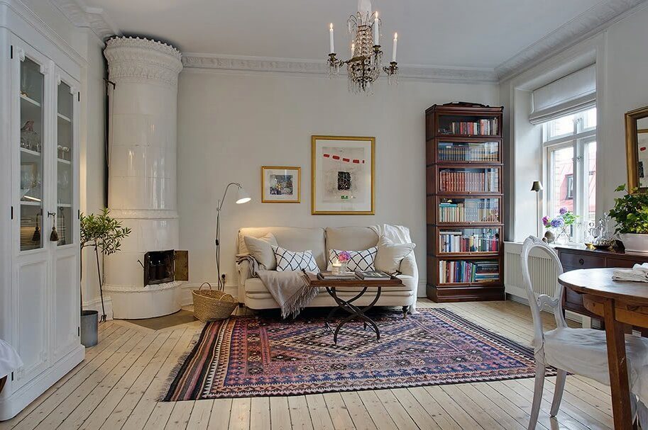 Pour le zonage de la pièce, des chaises ou des casiers sont utilisés. Vous pouvez décorer le salon avec des chandeliers en fer forgé, des pots de fleurs élégants ou des personnages en argile ou en bronze. En outre, utilisez des peintures, des tapis avec un motif, des photographies ou des accessoires que vous avez créés.