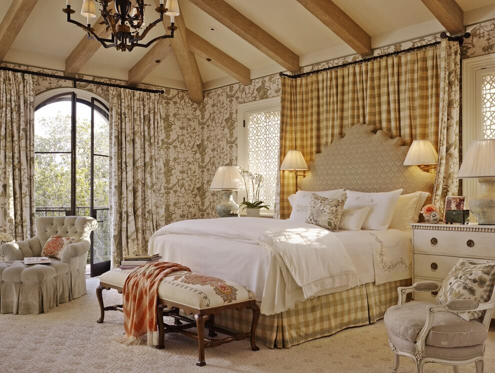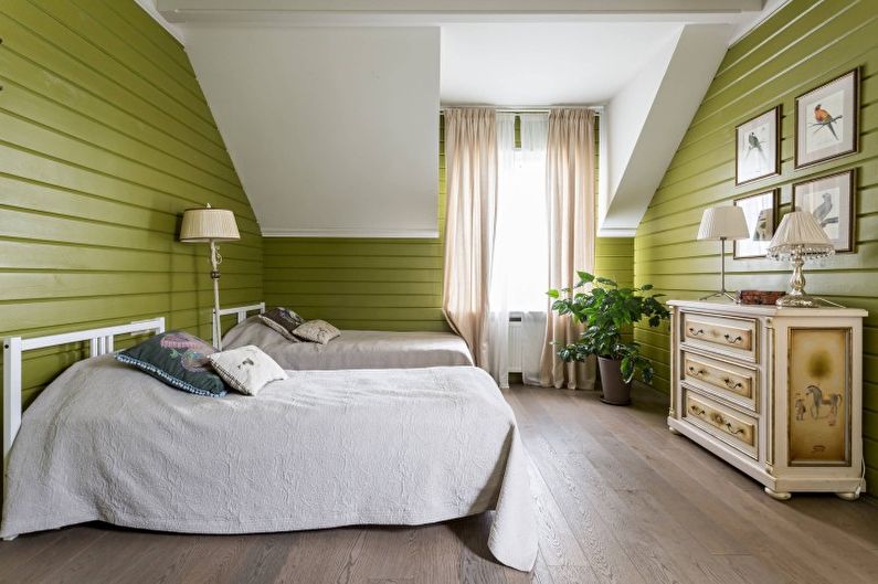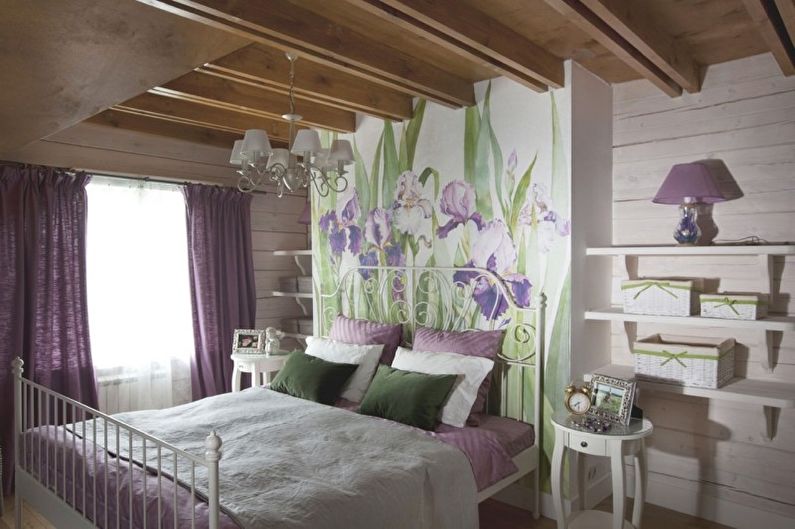 Une chambre de ce style deviendra le coin le plus calme et le plus confortable de l'appartement. Il est important que le plafond soit léger et solide, tandis que pour la décoration des murs, vous pouvez utiliser des motifs géométriques ou floraux, des poutres en bois, etc.