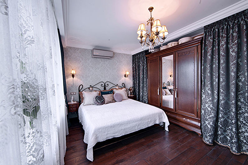 Il ne devrait pas y avoir trop de meubles dans la chambre. Il devrait être limité à un grand lit, une coiffeuse avec des éléments métalliques et une chaise en osier. Vous pouvez décorer la chambre à l'aide de peintures représentant de superbes paysages, d'une lampe de table et de textiles pratiques. Ceux-ci peuvent être des tapis fabriqués à la main, des couvre-lits en chiffons ou des oreillers en laine.
