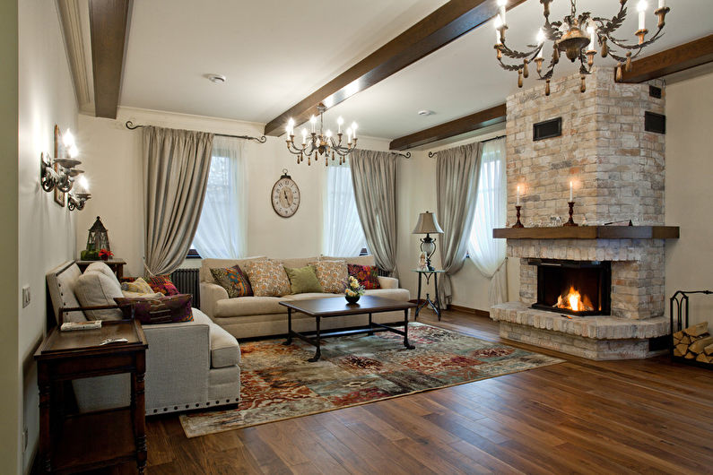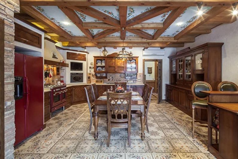 La tâche principale lors de la création d'un intérieur dans un style campagnard est le choix des revêtements pour les murs et les sols. L'avantage dans ce cas sont le bois, la pierre et d'autres matériaux naturels. Mais vous ne verrez pas les plafonds en plastique, les plafonds brillants ou les plafonds en vrac.