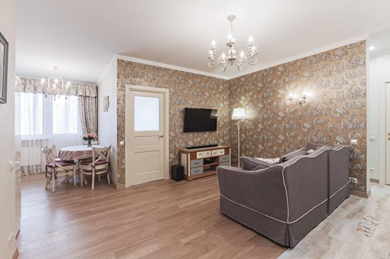 Lorsque vous choisissez une option de décoration murale, vous devez procéder à partir de la conception globale. Une option idéale serait un papier peint avec un motif discret (rayures, cage), de la brique ou du plâtre décoratif.
