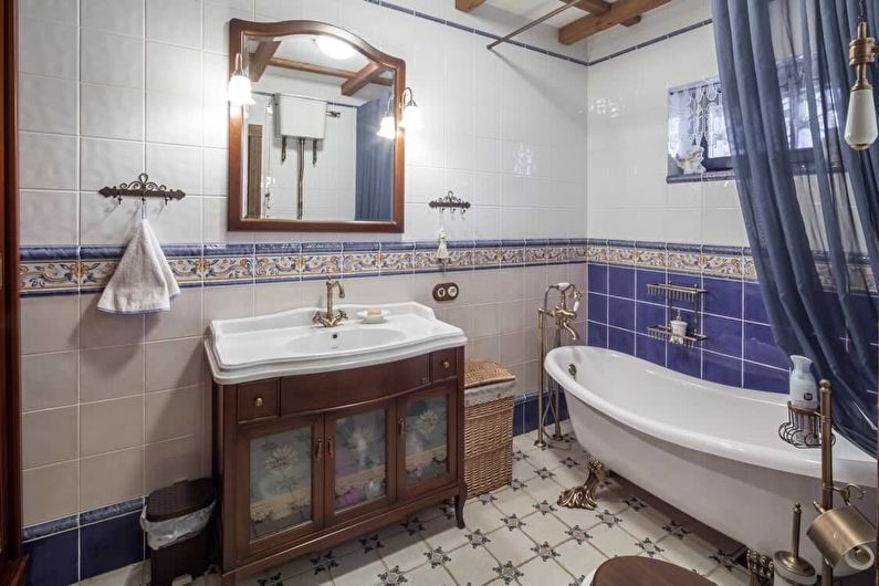 Les serviettes forgées et les meubles modulaires auront fière allure dans la salle de bain. Pour le revêtement du sol et des murs, on utilise des carreaux de pierre ou de couleur claire. Des miroirs vieillis, des porte-savons en argile, des tapis en matériaux naturels sont choisis comme décor.