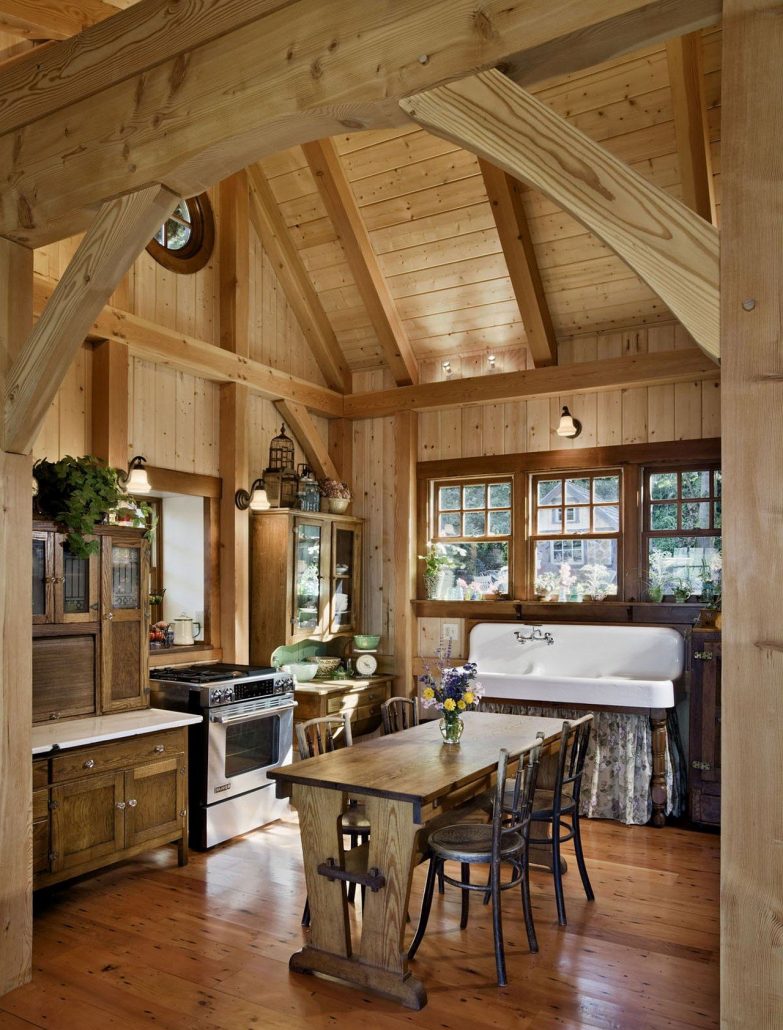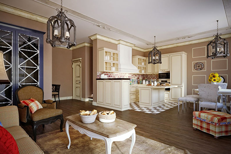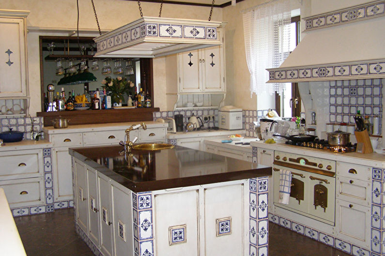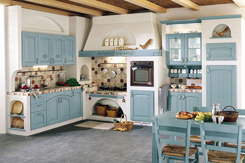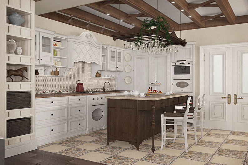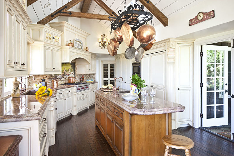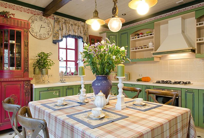 La salle doit être spacieuse et lumineuse. Très souvent, la cuisine est combinée avec la salle à manger. De la salle à manger, la zone de cuisson est séparée par un comptoir de bar ou un comptoir. Dans le même temps, il est assez difficile de placer des appareils ménagers modernes dans un intérieur rustique. Par conséquent, il est souvent souvent simplement caché dans des casiers ou décoré d'antiquités. Dans un décor, de beaux plats sont utilisés - assiettes peintes, bocaux ou pelles.