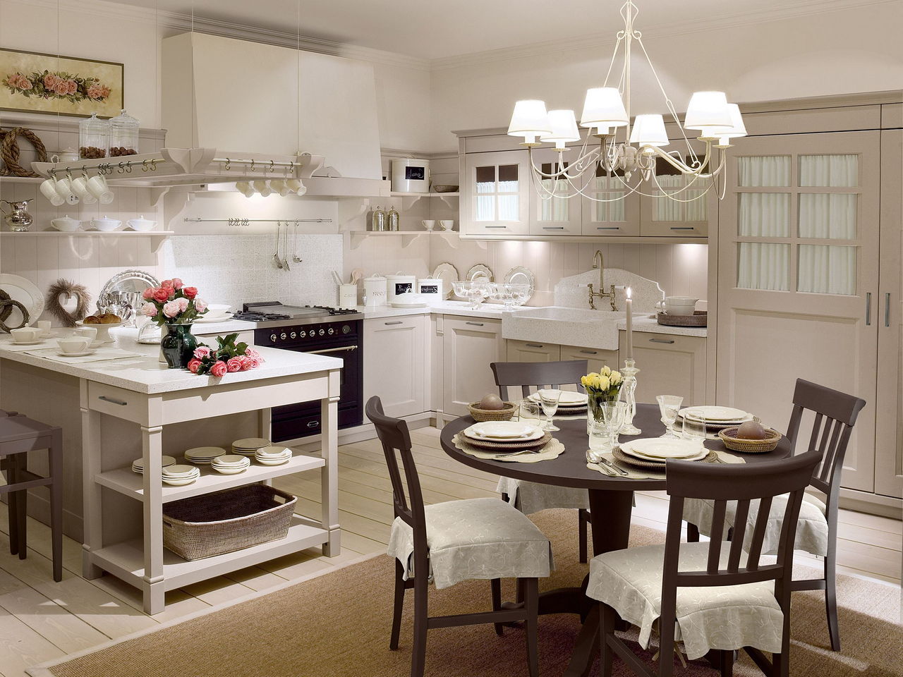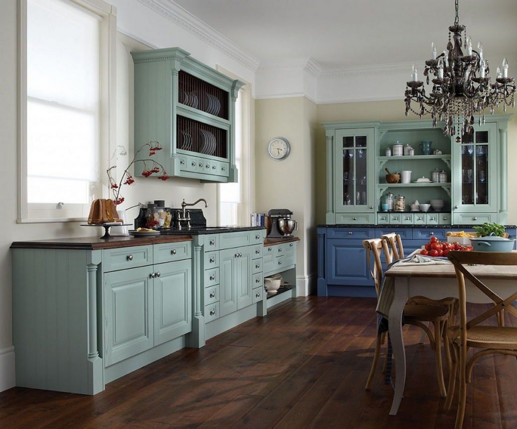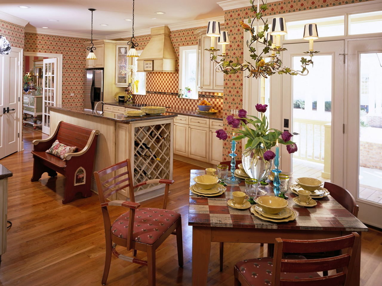 La salle doit être spacieuse et lumineuse. Très souvent, la cuisine est combinée avec la salle à manger. De la salle à manger, la zone de cuisson est séparée par un comptoir de bar ou un comptoir. Dans le même temps, il est assez difficile de placer des appareils ménagers modernes dans un intérieur rustique. Par conséquent, il est souvent souvent simplement caché dans des casiers ou décoré d'antiquités. Dans un décor, de beaux plats sont utilisés - assiettes peintes, bocaux ou pelles.