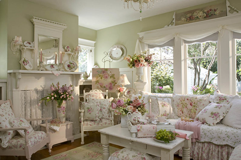 Pour rendre la pièce confortable, il est important d'utiliser de nombreux détails. C'est pourquoi la Provence convient principalement aux salles de grande surface. Le style se marie parfaitement avec les éléments en fer forgé, les dessins, les plantes d'intérieur et diverses figurines. Et, bien sûr, dans une telle pièce, il devrait y avoir beaucoup de soleil.