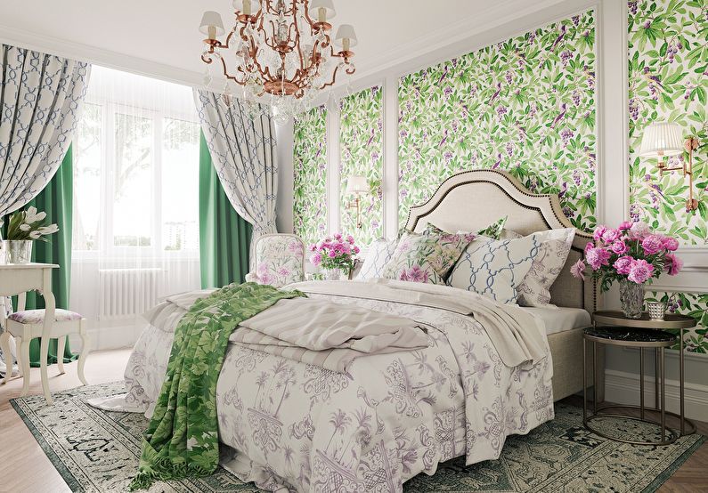 Le style provençal est caractérisé par de grands lits avec des têtes de lit en fer forgé, peintes avec de la peinture blanche. Les textiles peuvent être de couleurs pastel, ornés d'insertions de dentelle ou de motifs floraux délicats.
