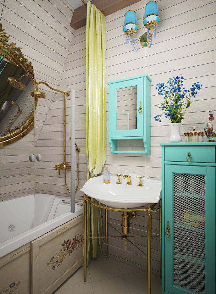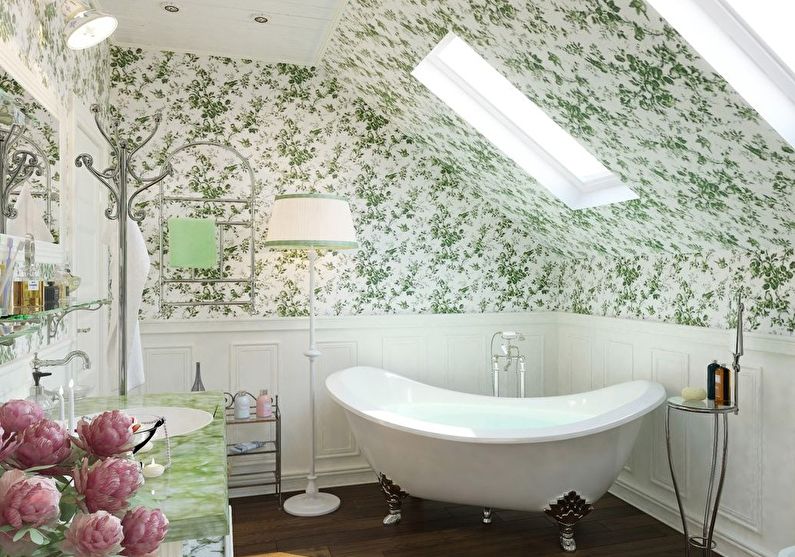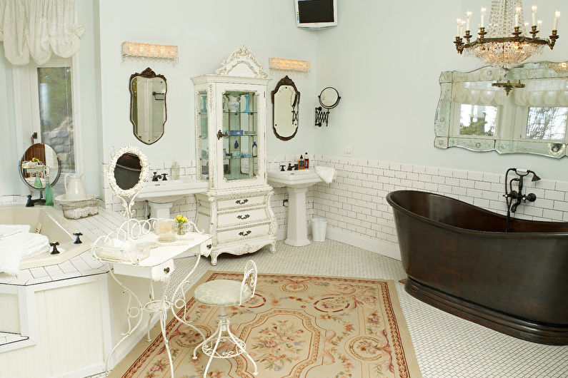 La principale chose dans cette pièce devrait être la salle de bain dans le style canonique. Mais la douche ici sera inappropriée. Les carreaux doivent choisir des tons pastel. Idéal si c'est mat. Seul le bas du mur peut en être fini, tandis que le haut est simplement peint à la peinture blanche ou décoré de plâtre.