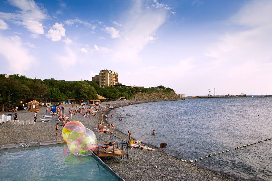 Toutes les plages de la station sont en galets, quelque part avec des petits cailloux, quelque part avec des grandes. Dans la région d'Anapa, ils sont principalement sablonneux et, grâce à cette exception, l'eau de la mer est très propre et transparente. La zone côtière est profonde, vous devez donc être extrêmement attentif à ceux qui reposent avec des enfants. Et ce facteur rend également la mer le long de la côte fraîche. La plage peut être trouvée pour tous les goûts. Il y a des lieux animés avec de nombreuses attractions, des boutiques de souvenirs et des bars. Et il y a des coins isolés où vous pouvez être seul avec la nature.