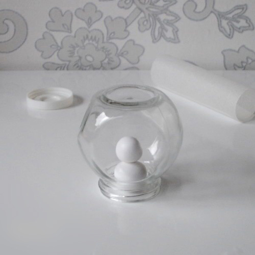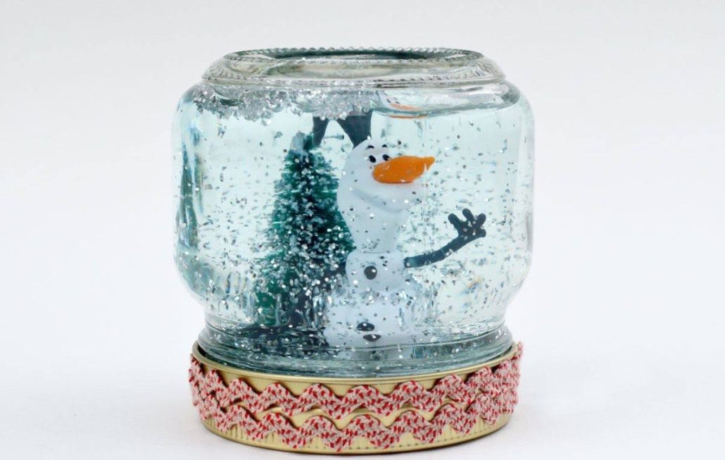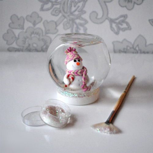Maintenant, nous commençons à faire le ballon directement. Tout d'abord, couvrez l'intérieur avec de la colle imperméable. Ce peut être un pistolet à colle ou une colle. Après cela, une figurine de bonhomme de neige est collée sur le couvercle et l’espace autour est décoré d’étincelles ou d’un autre décor.