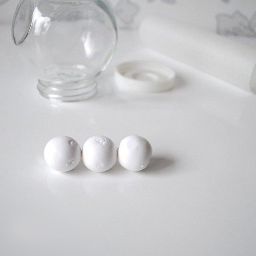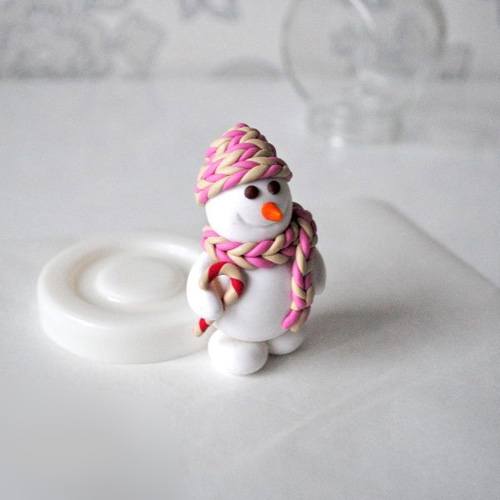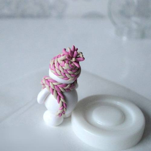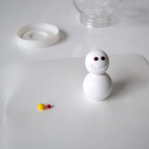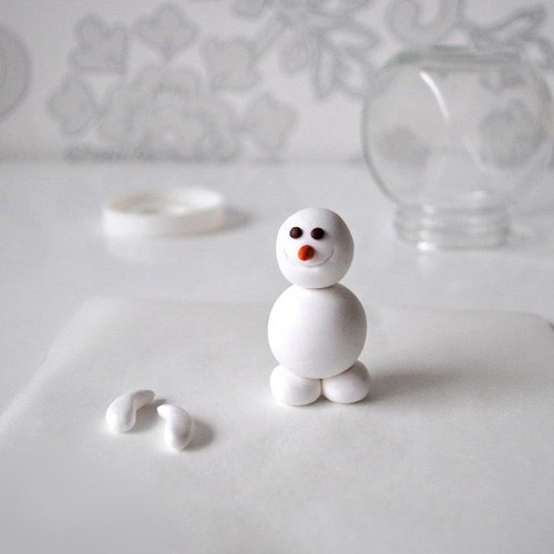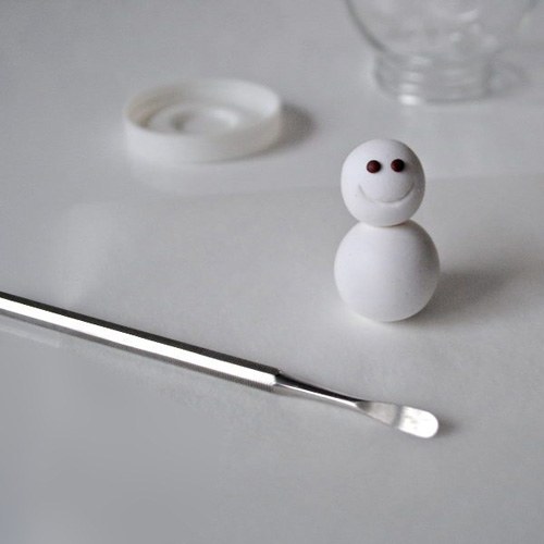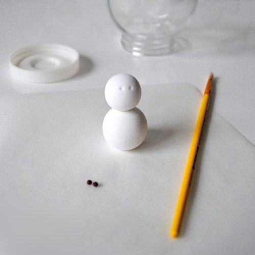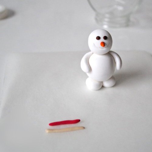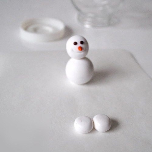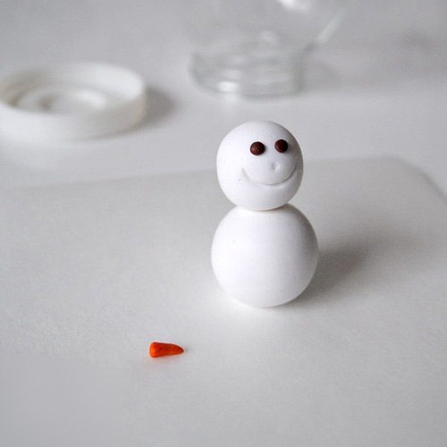 Habituellement, lorsqu’on travaille avec de la pâte polymère, des outils spéciaux sont utilisés. Mais si vous ne les avez pas, vous pouvez toujours trouver sous la main des objets appropriés pour les remplacer. En utilisant un cure-dent ou le bord du minou, vous devez faire 2 encoches pour les yeux. Après cela, des perles noires ou de petites perles sont insérées ici. Fait de même un sillon pour la bouche du bonhomme de neige.