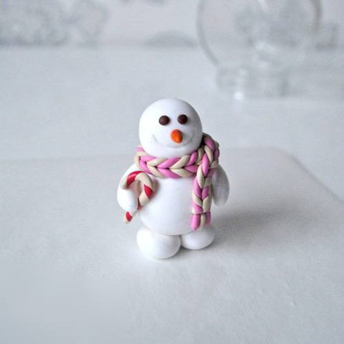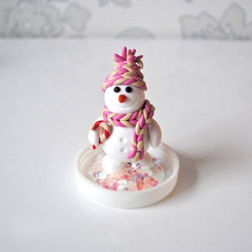 Vous pouvez décorer un bonhomme de neige de différentes manières. Par exemple, donnez-lui un petit bonbon à la main. Pour ce faire, nous roulons plusieurs fines saucisses à partir d'argile multicolore et les roulons légèrement en les tordant ensemble. Ensuite, il ne reste plus qu'à donner à la pièce la forme d'un bonbon. De plus, il peut être recouvert de brillant.