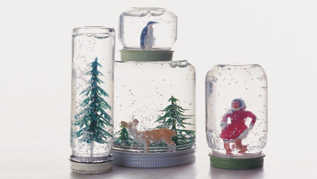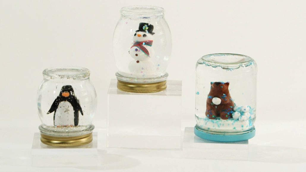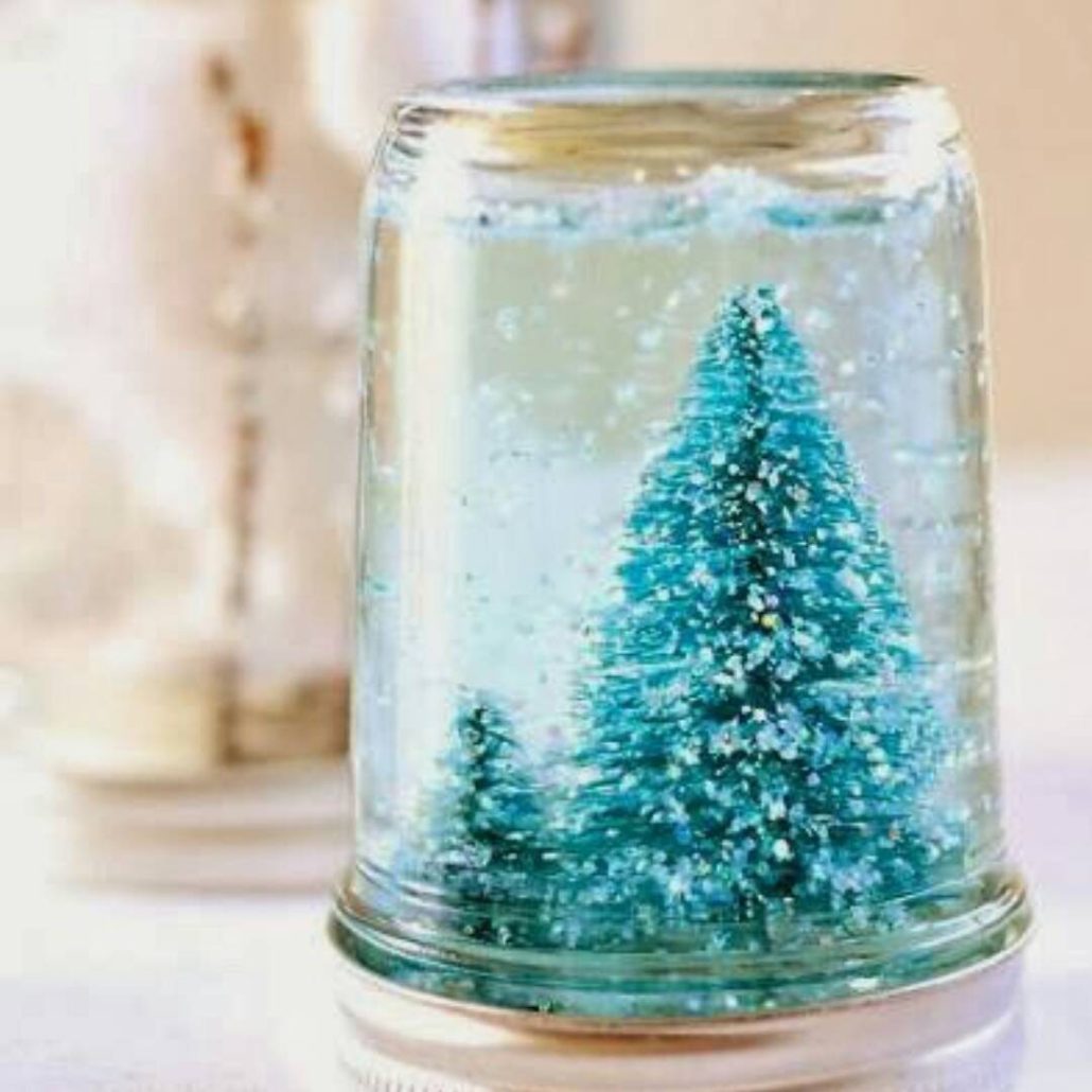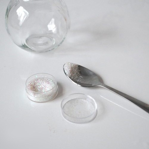 Nous utilisons des paillettes comme neige.Il est conseillé qu’elles soient grandes, car les petites sont trop légères et ne risquent pas de couler au fond.