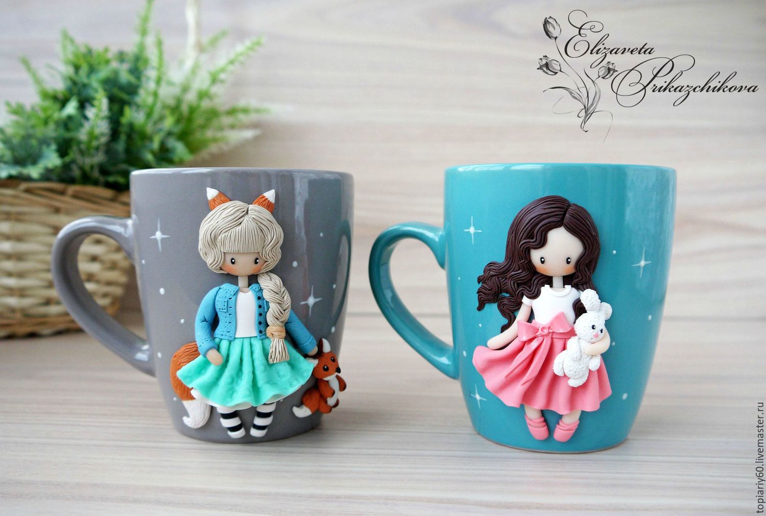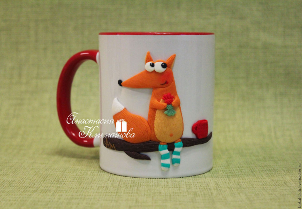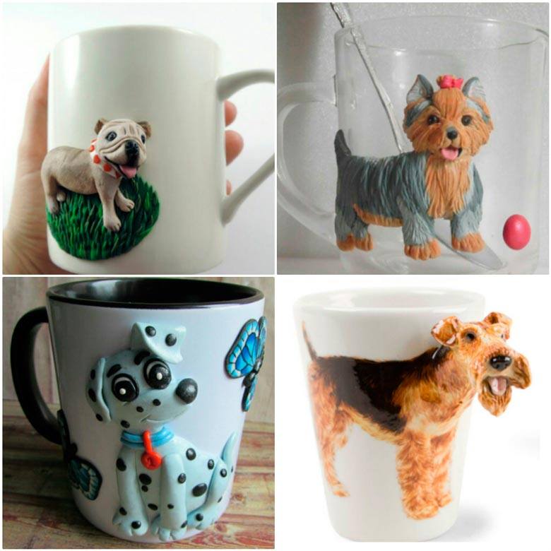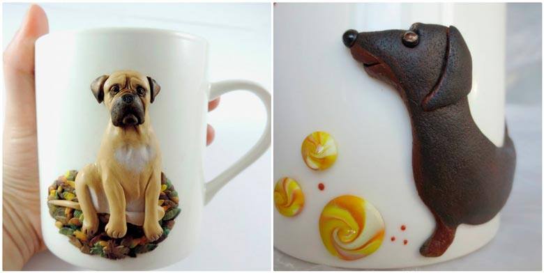 Tout d’abord, sur la tasse, vous devez dessiner les contours de la future figure. Plus loin de l'argile, en utilisant des collations ou d'autres matériaux improvisés, pour aveugler le chien. Prêt figure, cuire au four jusqu'à ce que durci à 120 degrés. Si vous aviez de l'argile blanche, alors vous devez la décorer.