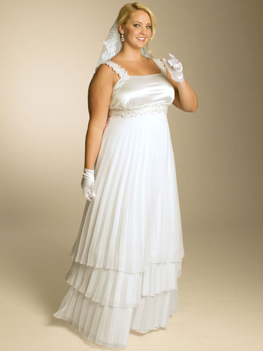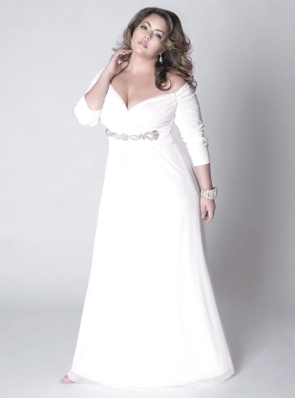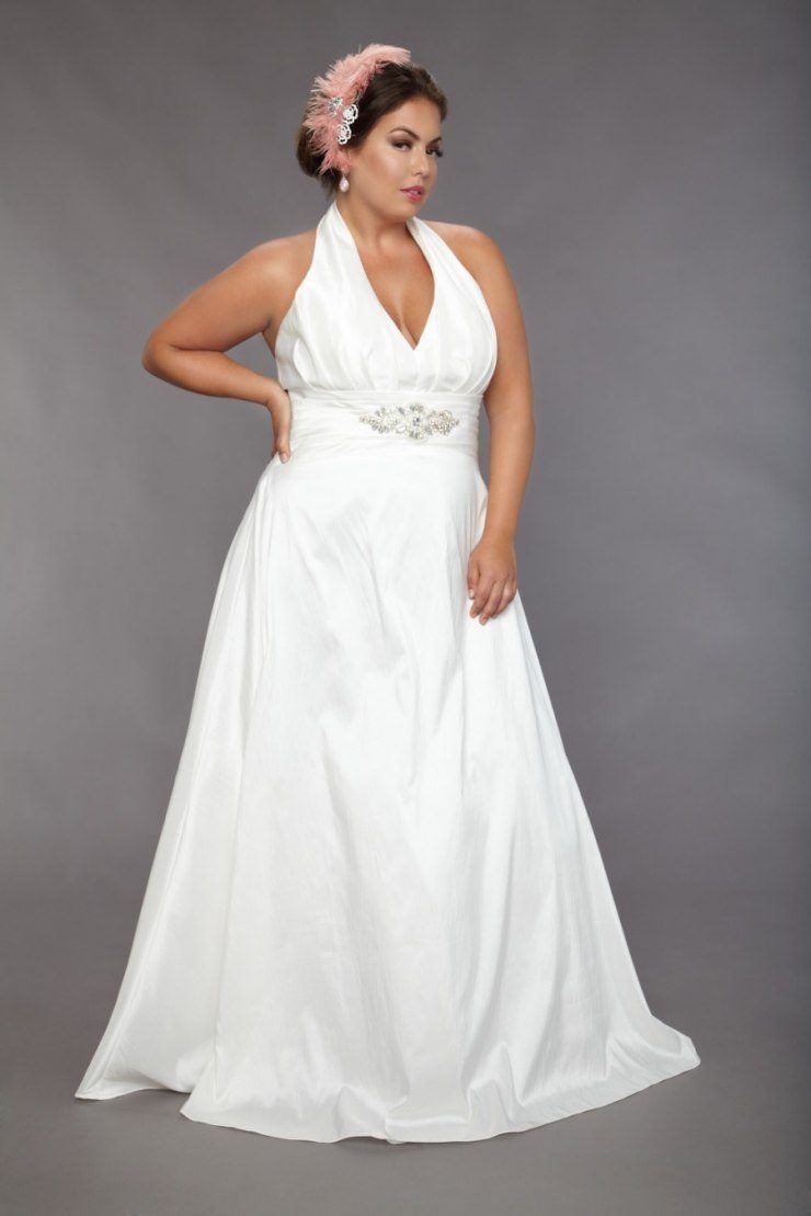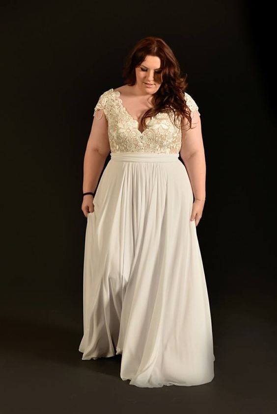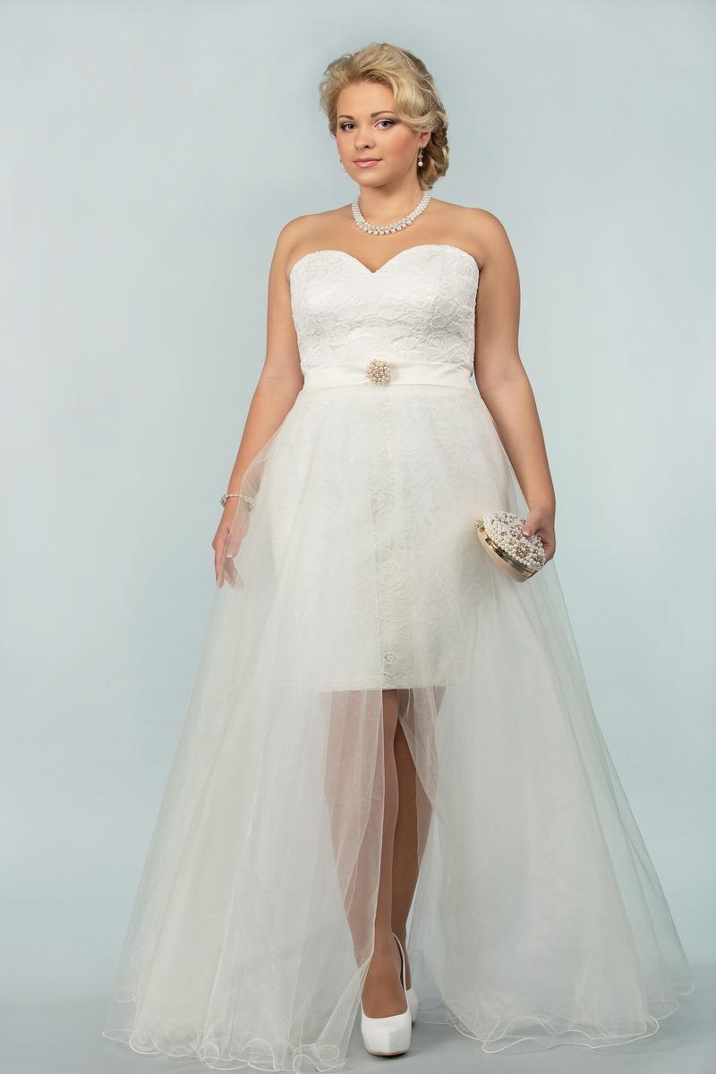 Pas toujours les femmes en surpoids préfèrent une robe de mariée longue. Il y a aussi des gens qui sont prêts à choisir une robe courte comme robe de mariée. Bien sûr, les robes de mariée courtes et longues ne ressemblent pas à des mini. Ils sont exécutés avec retenue et assez décemment. À propos, il est intéressant de noter que même les robes de mariée courtes cachent des hanches lourdes et un ventre volumineux.