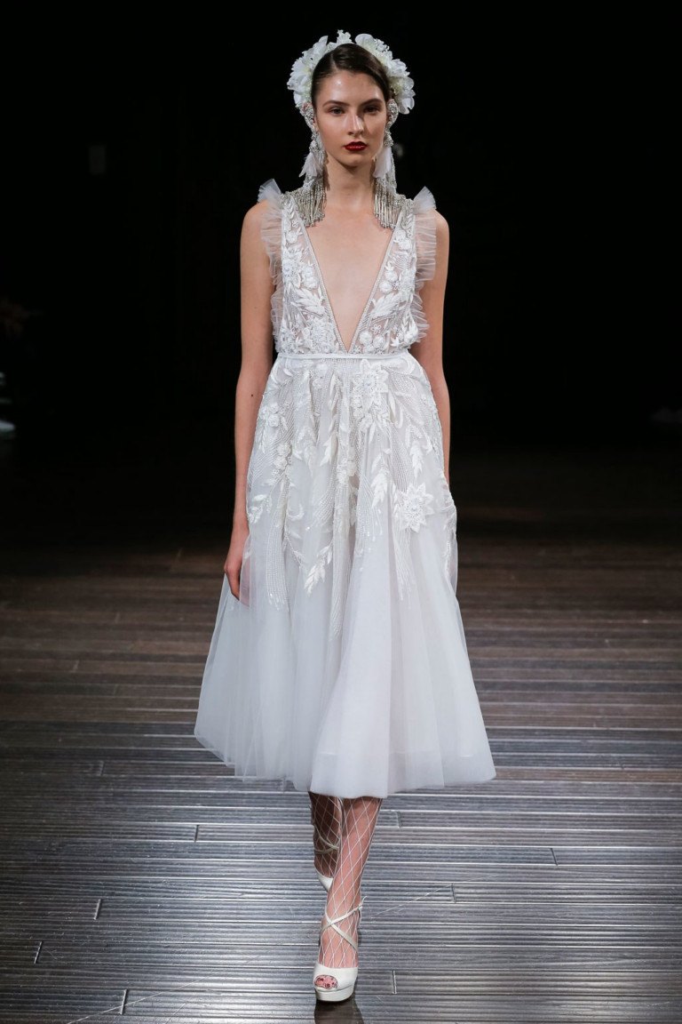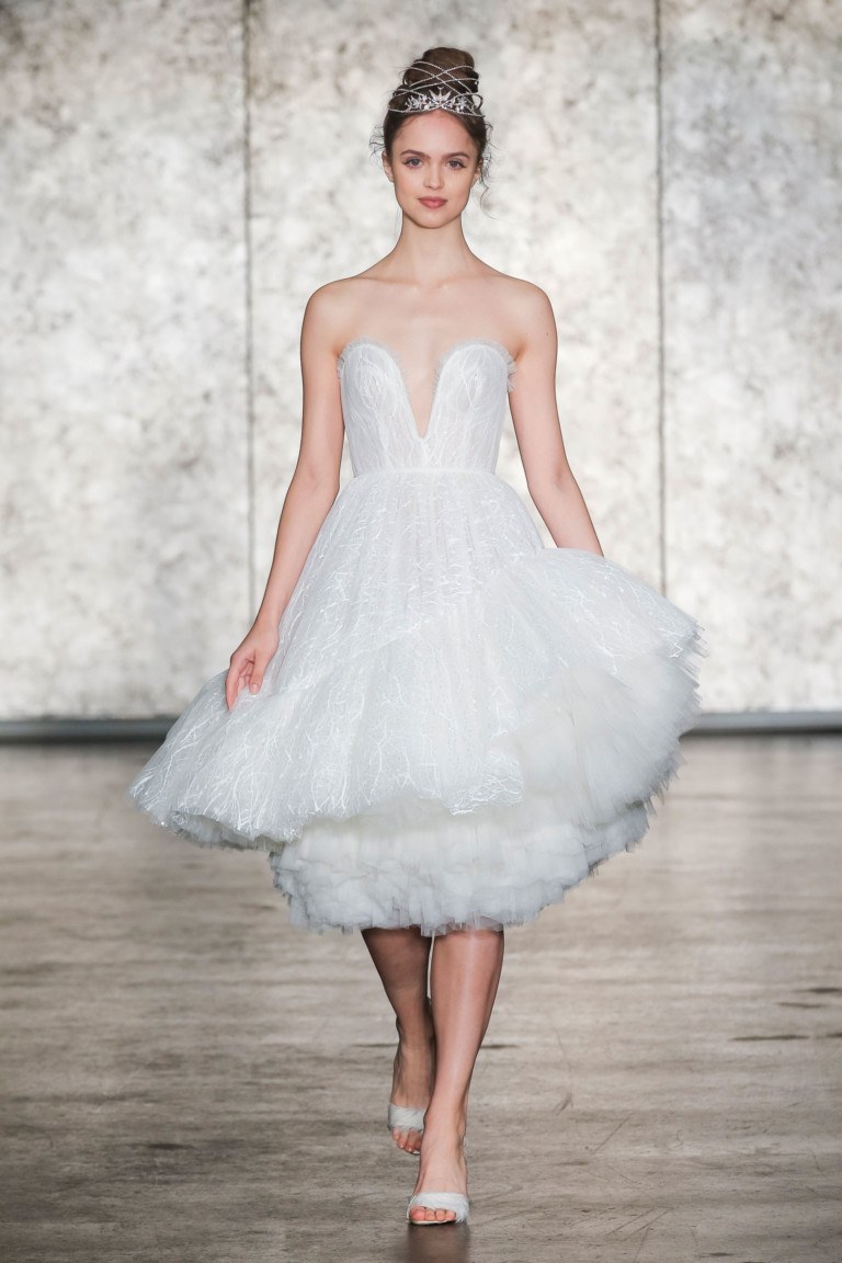 Dans chaque collection BRIDAL, il existe des modèles raccourcis d'une robe de mariée. Les styles de tenues raccourcies sont variés. Il existe des options luxuriantes, ajustées, avec et sans manches. La mariée est autorisée à briller un jour de fête avec un décolleté profond et des courbes sexy dans le dos, que de nombreuses robes ne cachent pas. Des looks délicats et élégants sont possibles grâce à une robe de mariée raccourcie. L'avantage d'une robe de mariée courte est qu'elle peut toujours être portée lors d'un événement social.