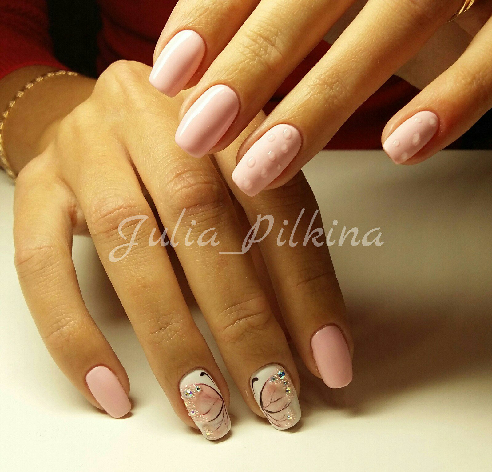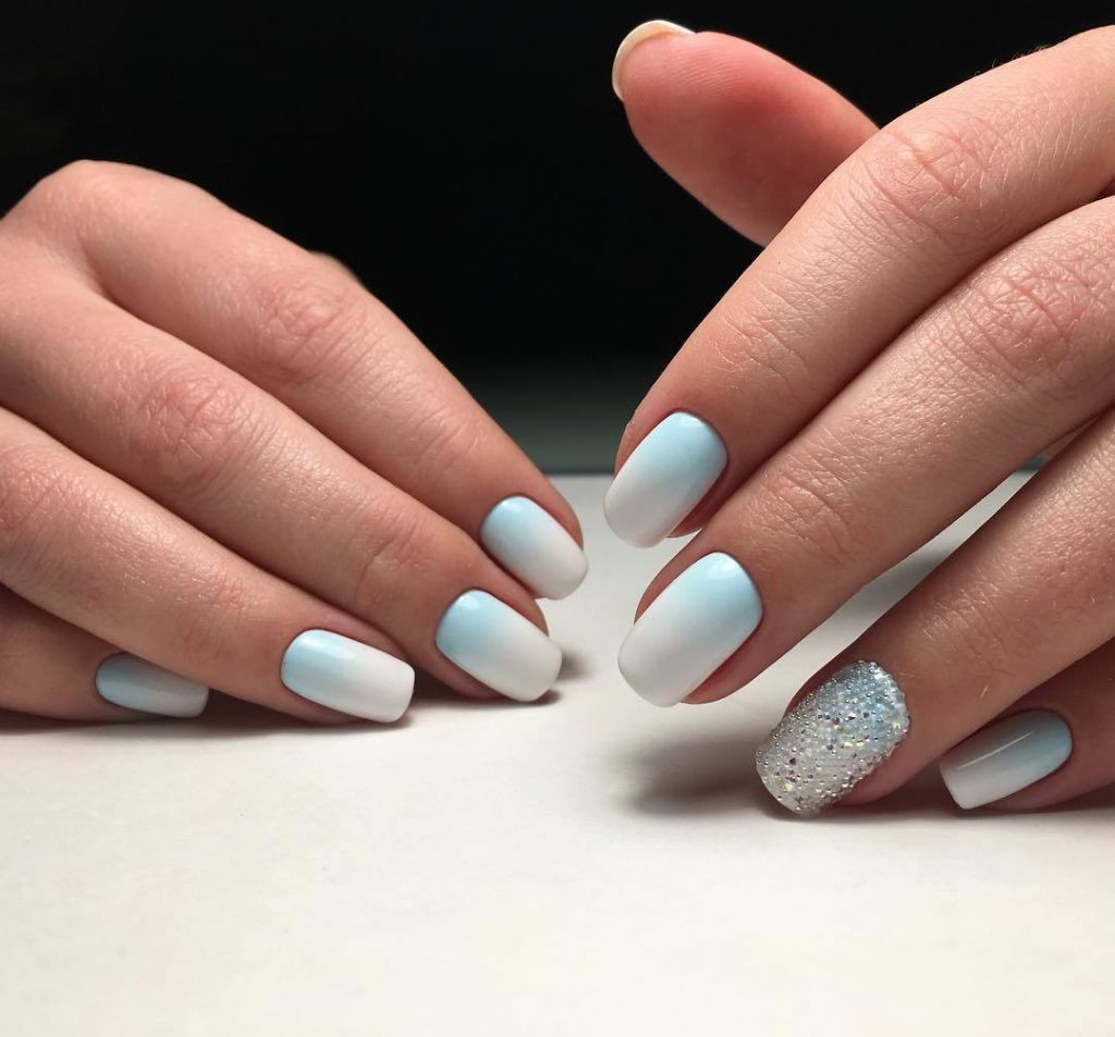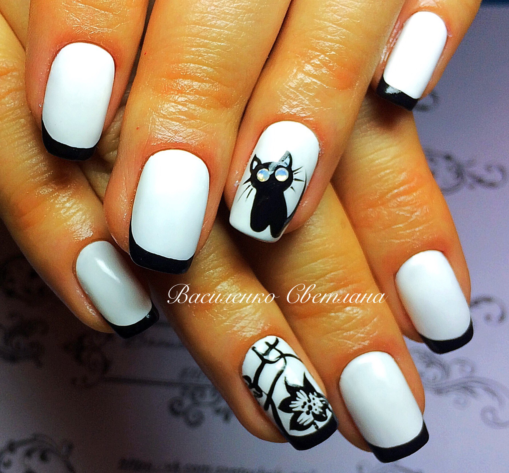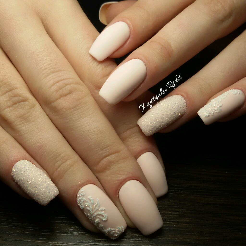 Les tendances modernes disent qu’il est possible et nécessaire de mélanger des textures. L’option la plus en vogue est l’enduit incomplet de l’ongle avec un vernis mat, et remplit l’espace restant de lustre classique, d’étincelles ou de frottement.