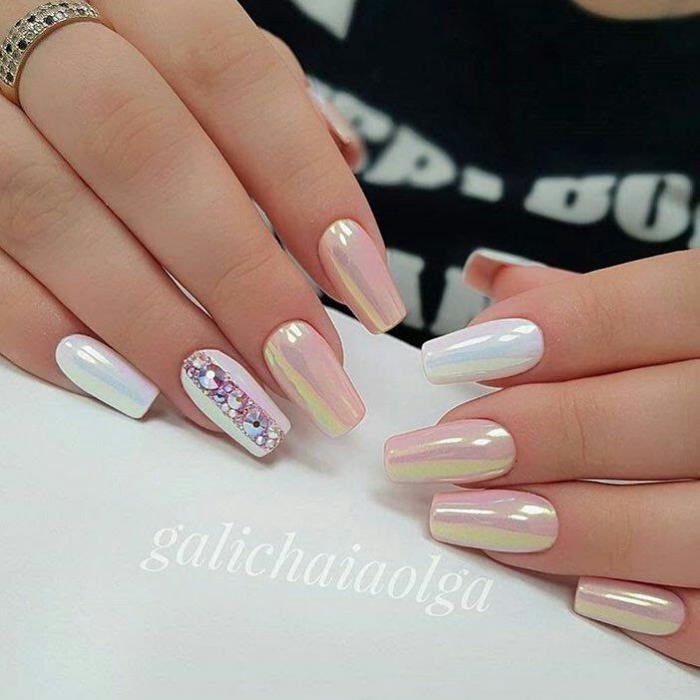 Le frottement des perles est pratique pour mettre en valeur certains ongles. Tout ce dont vous avez besoin est de recouvrir tous les ongles avec une sorte de vernis et de donner à l'accent un pigment de perle. Vous créerez ainsi une manucure modeste et raffinée.Mais vous pouvez faire exactement le contraire en frottant presque tous vos ongles et en choisir une paire avec un vernis mat ou ordinaire. Nous permettons également l’utilisation du frottement de perles pour tous les ongles, il aura l’air magnifique au soleil.
