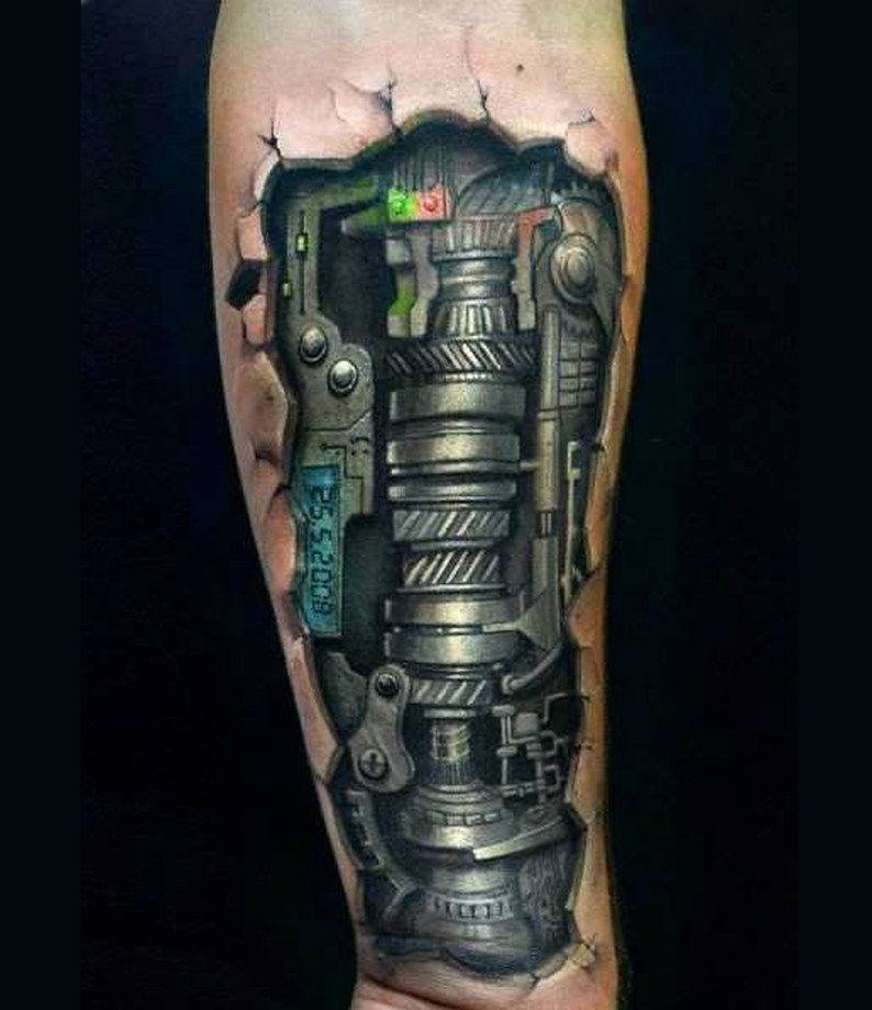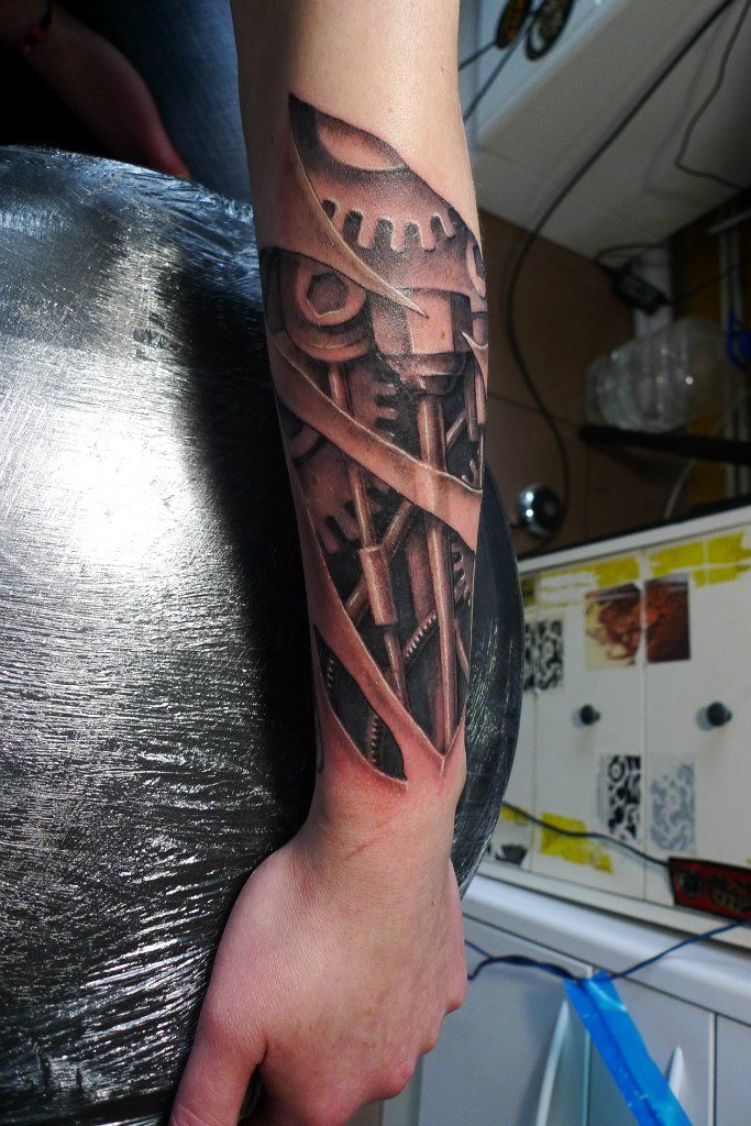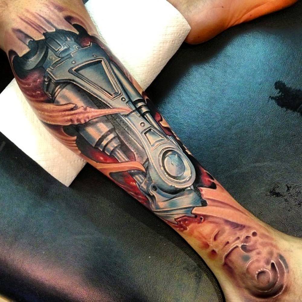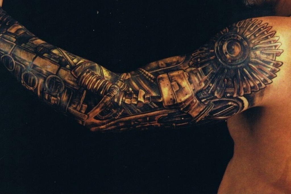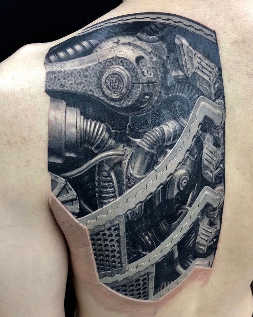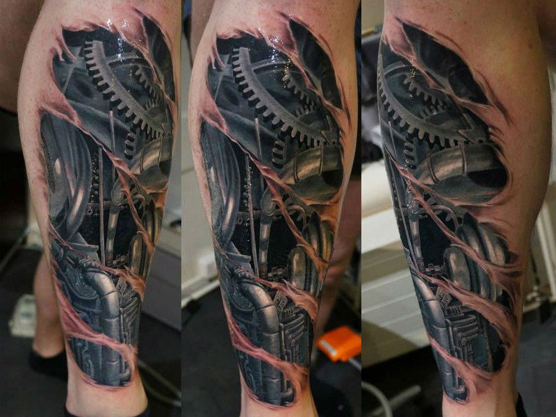 La biomécanique est un style relativement jeune dans l'art du tatouage. Ce format de tatouage original est devenu populaire à la fin du XXe siècle. Biomécanique du tatouage - l'image sur le corps de divers mécanismes, comme si elle déchirait la peau. Des engrenages en acier sophistiqués, des engrenages, des pistons et divers engrenages sont la base d'un tatouage biomécanique. La mode pour un tel tatouage a grandi avec le développement du progrès technologique. Les thèmes de l'intelligence artificielle, des robots et des livres de science-fiction ont suscité l'intérêt du public pour les tatouages dans le style de la biomécanique, ce qui rapproche les gens des cyborgs et des robots.